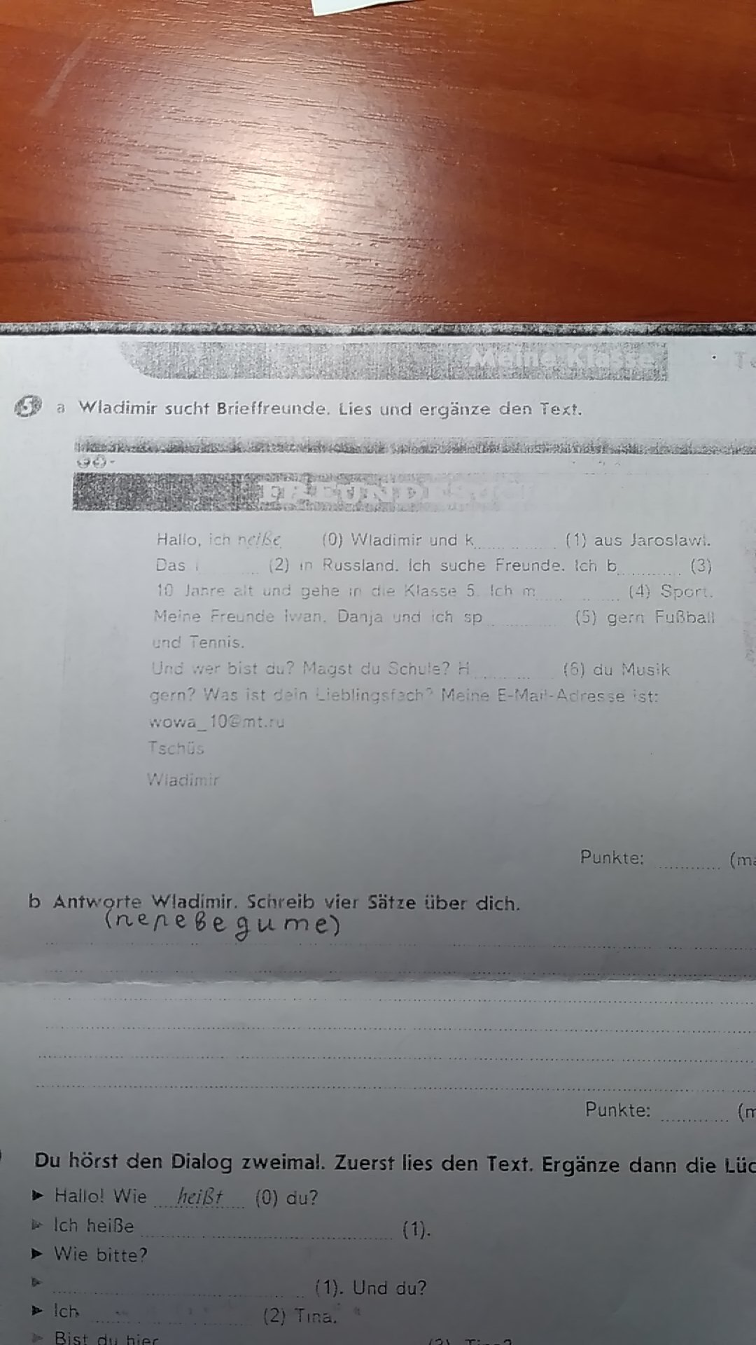 задание б: Hallo, Wladimir, mein Name ist (напиши имя), ich bin (возраст) Jahre und ich wohne in (название города). Ich mag die Schule gern. Ich höre pop - musik. (или любое другое название музыки) Mein Lieblingsfach ist deutsch. (или любой другой школьный предмет:Mathematik, Sprachen, Musik, Sport и тд.)