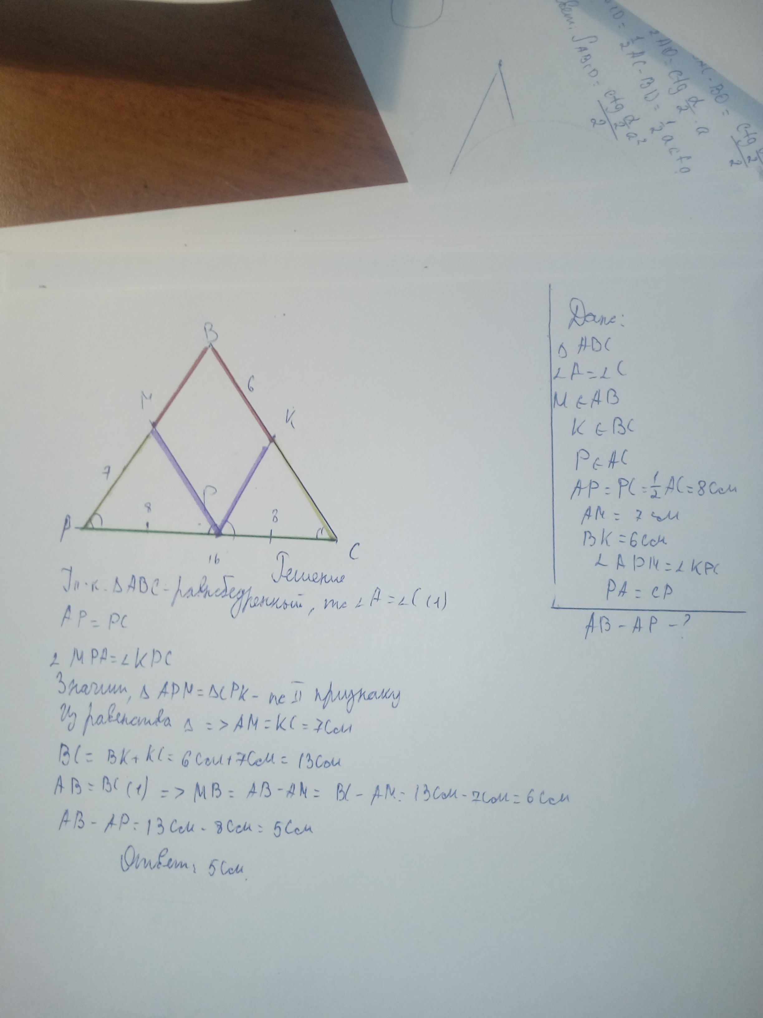 На сторонах AB, BC, AC равнобедренного треугольника ABC с основанием AC отмечены точки M, K и P соответственно так, что <APM=<KPC, PA=CP, AC=16см, AM=7см, KB=6см. Найдите разность длин AB и AP