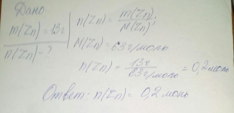 m(Zn) = 13 г n(Zn) = m(Zn) / М(Zn) = 13 г / 65 г/моль = 0,2 моль