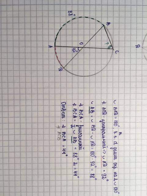 угол AOD равен 92 , угол ВОС=92 как вертикальные углы, треугольник ВОС равнобедренный, найдем из него искомый угол.180-92=88 это приходится на 2 угла т.к треугольник равнобедренный то угол ACB. =44 градуса