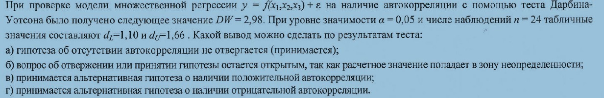 Ответ: г) принимается альтернативная гипотеза о наличии отрицательной автокорреляции;