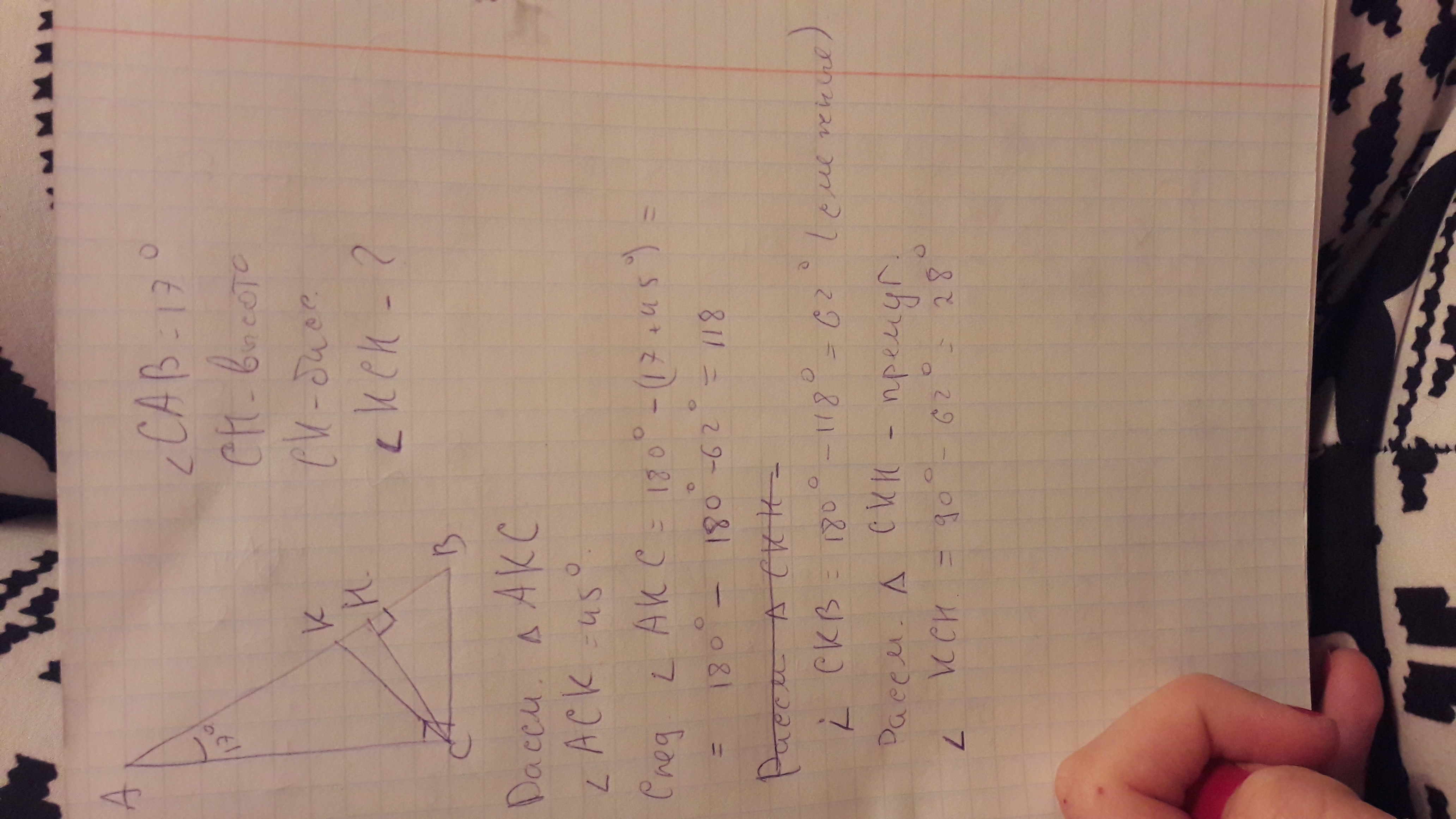 Задача. Один из острых углов прямоугольного треугольника равен 17 градусов. Найти градусную меру угла между высотой и биссектрисой, проведенными из вершины прямого угла.