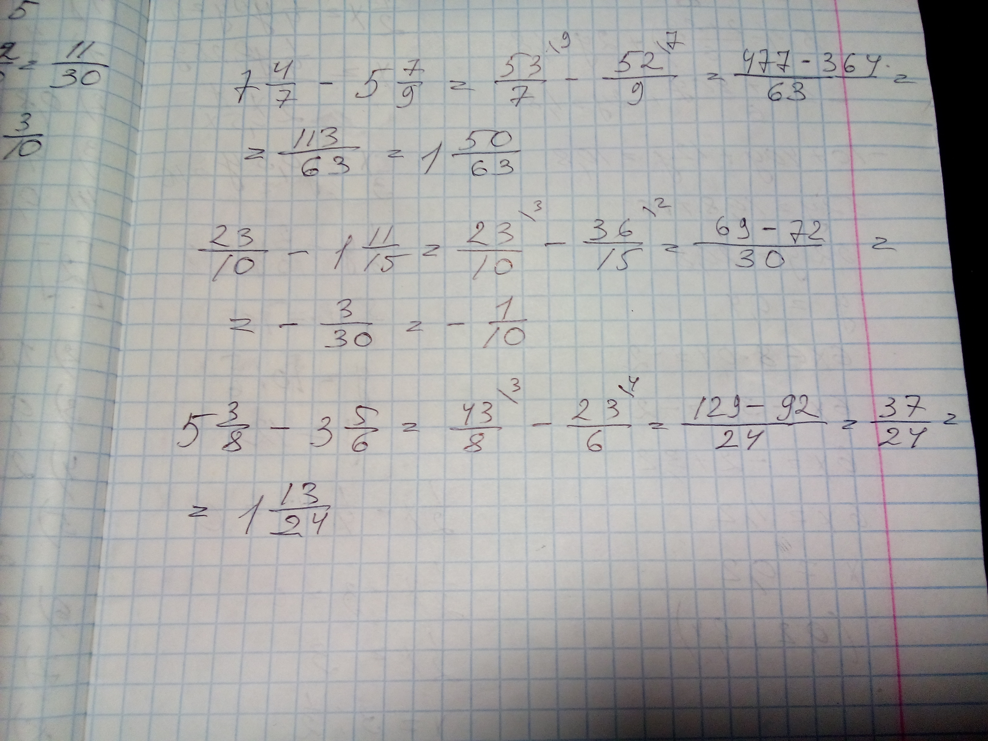 Решить примеры: 7 4/7-5 7/9, 23/10-1 11/15, 5 3/8-3 5/6 полный расклад