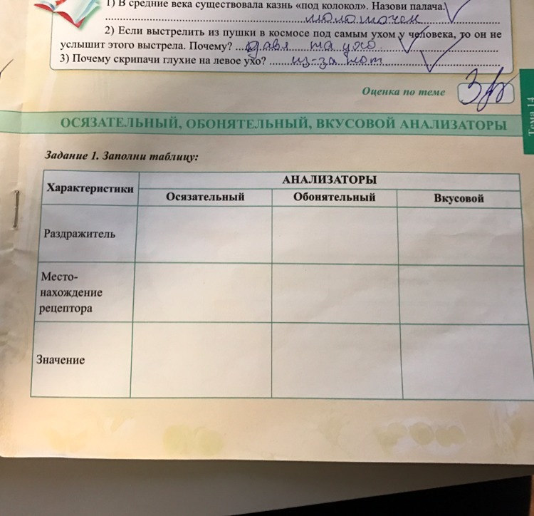 2 столбец: раздражитель- запах, место нахождение- нос, значение определение запаха ( можно определить свежий ли продукт )