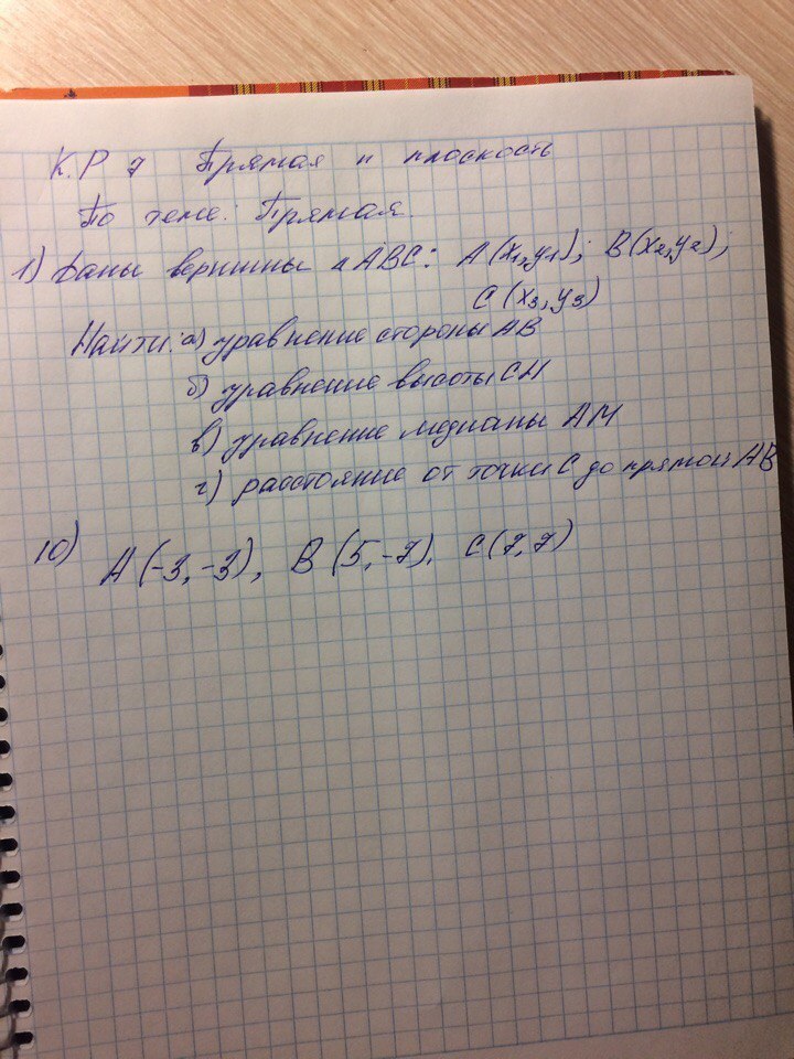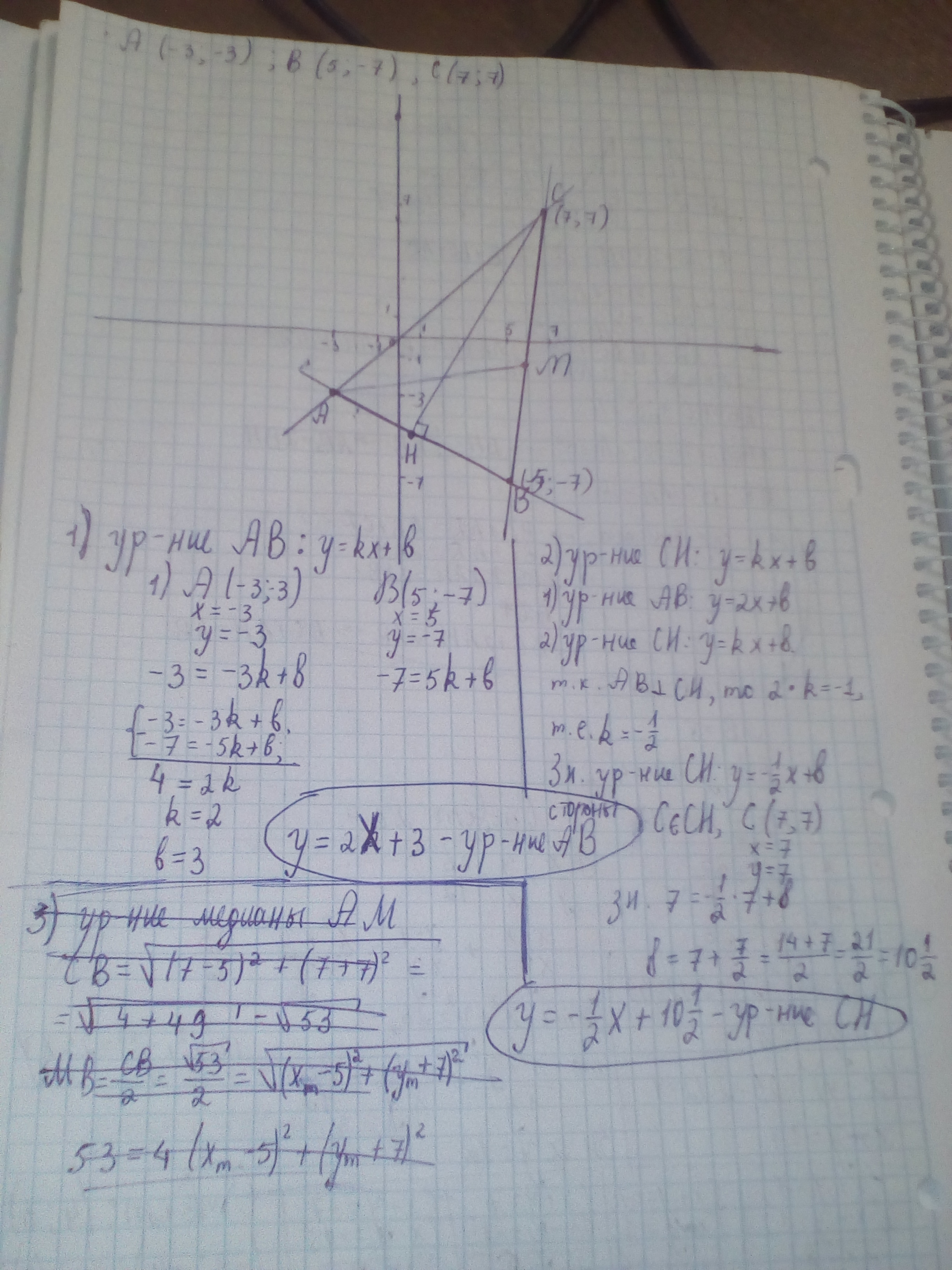 Даны вершины треугольника АВС. Найти уравнение стороны АВ, уравнение высоты СН, уравнение медианы АМ, расстояние от точки С до прямой АВ.