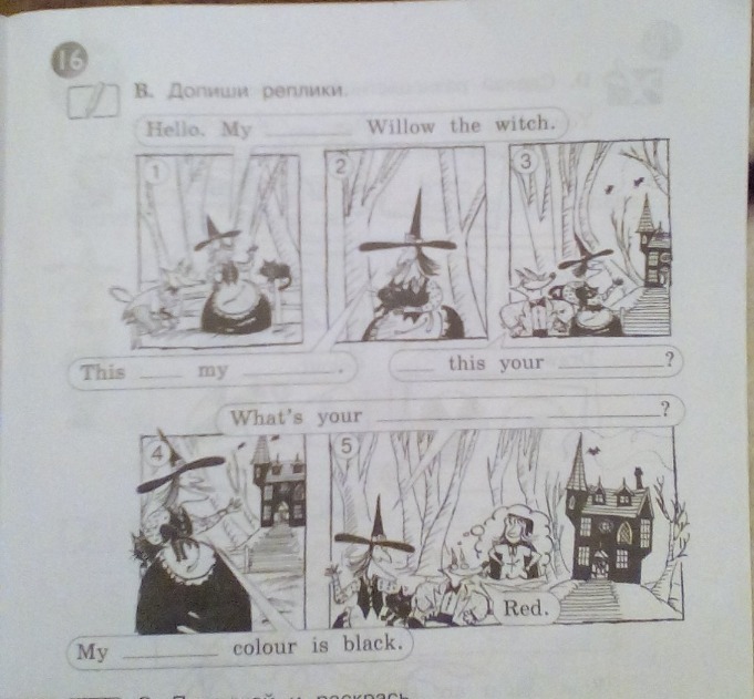 Допишите реплики. Hello. My ....... Willow the witch. This....... my ........ ....... this your......? What s your ....... .......? My ...... colour is black. What s your .... .......?