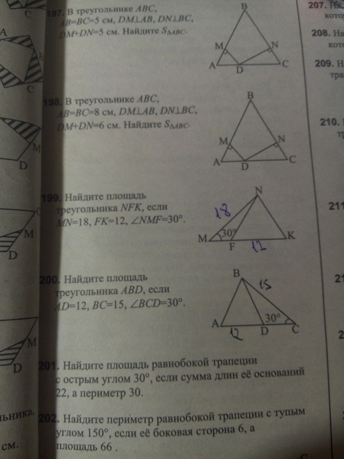S=1/2*18*12*sin30=108*1/2=54.Ответ площадь треугольника = 54.