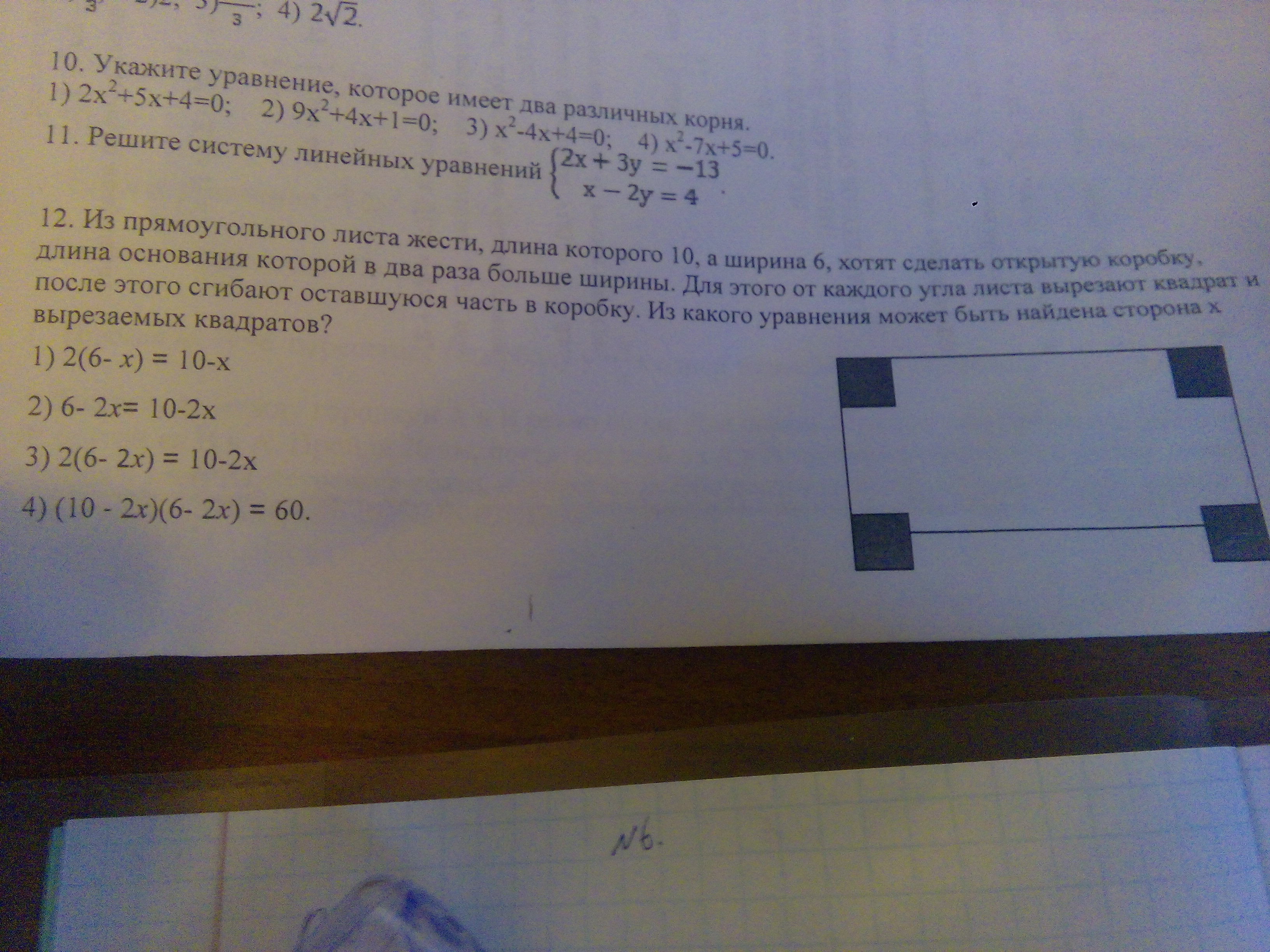 Пусть х - сторона квадрата, тогда (10-2х) - длина основания коробки, а (6-2х) - ширина основания коробки. По условию задачи длина коробки в два раза больше ширины коробки, значит можно составить уравнение: