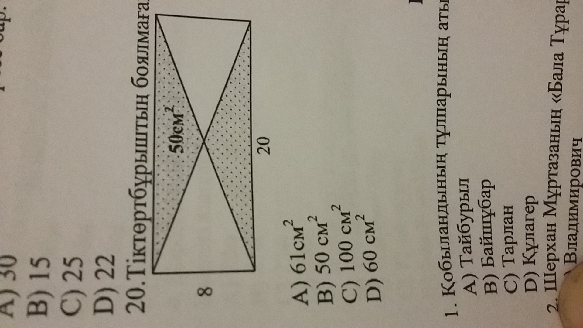 100 квадратных сантиметров, ибо треугольники равны, т.к образованы пересечением двух диагоналей прямоугольника.