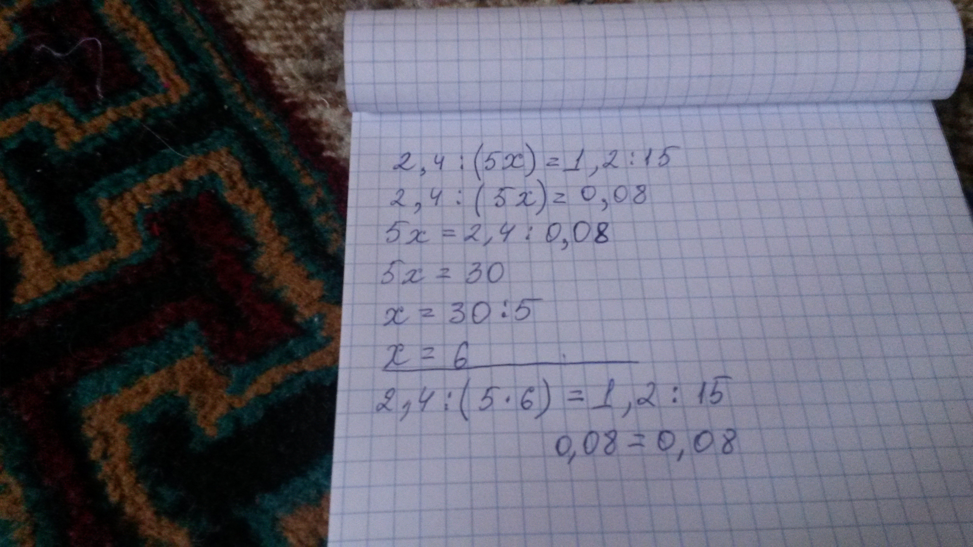 Сокращаем правую часть на 3 и получаем: 2,4:5х=0,4:5