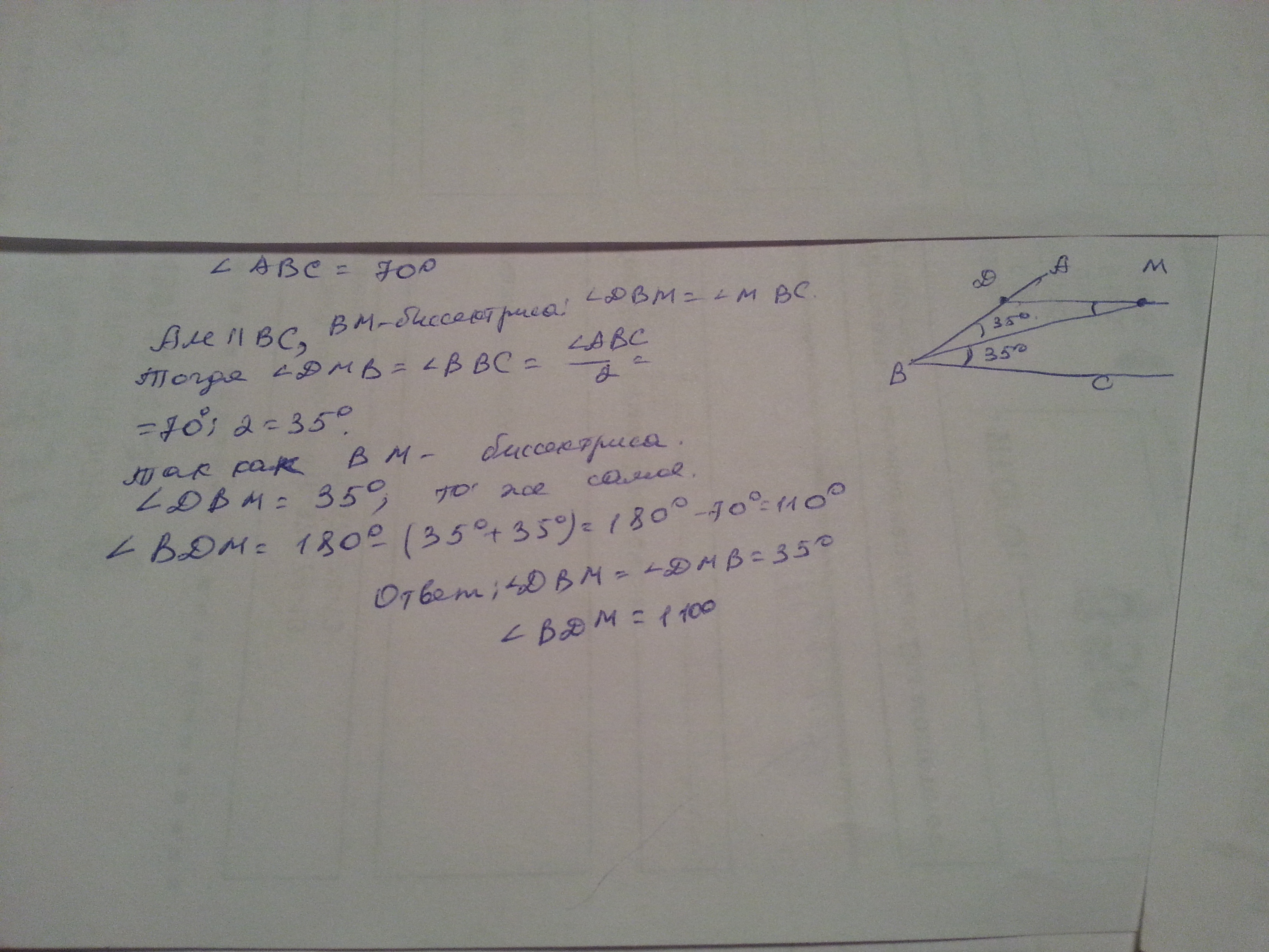 На одной из сторониугла абц отметили точку д черезз которую провели прямую параллельную вс эта прямая пересекает биссектрису угла АБС в точке м наидите углы треугольника вдм если угол АБС =70градусов