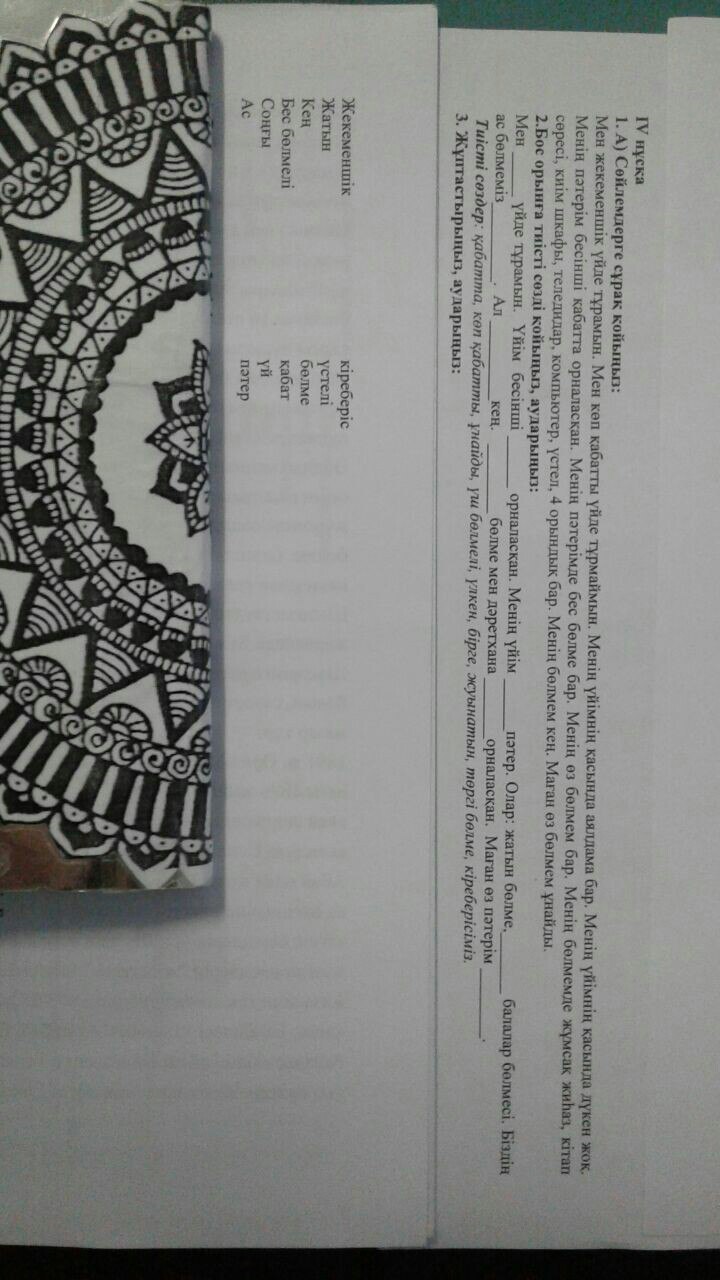 мен қандай уйде турамын? мен қандай уйде турмаймын? менін уйімнін қасында не бар? менін уйімнін қасында не жоқ? менін пəтерім нешінші қабатта орналасқан? менін пəтерімде неше бөлме бар? менін нем бар? менін бөлмемде нелер бар? менін бөлмем қандай? маған не унайды?