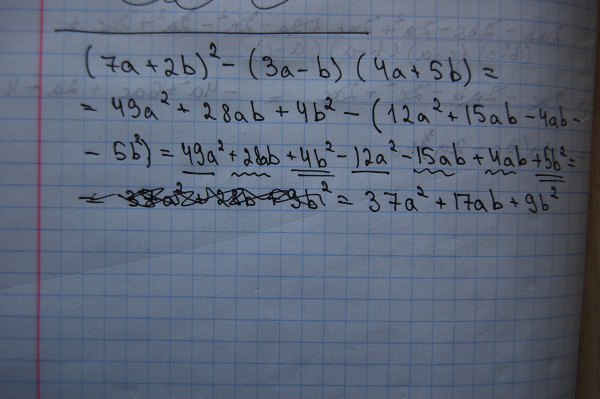 (7а+2b)^2 -(3a-b)(4а+5b)=49a^2+28ab+4b^2-(12a^2+15ab-4ab-5b^2)=49a^2+28ab+4b^2-12a^2-15ab+4ab+5b^2=37a^2+17ab+9b^2
