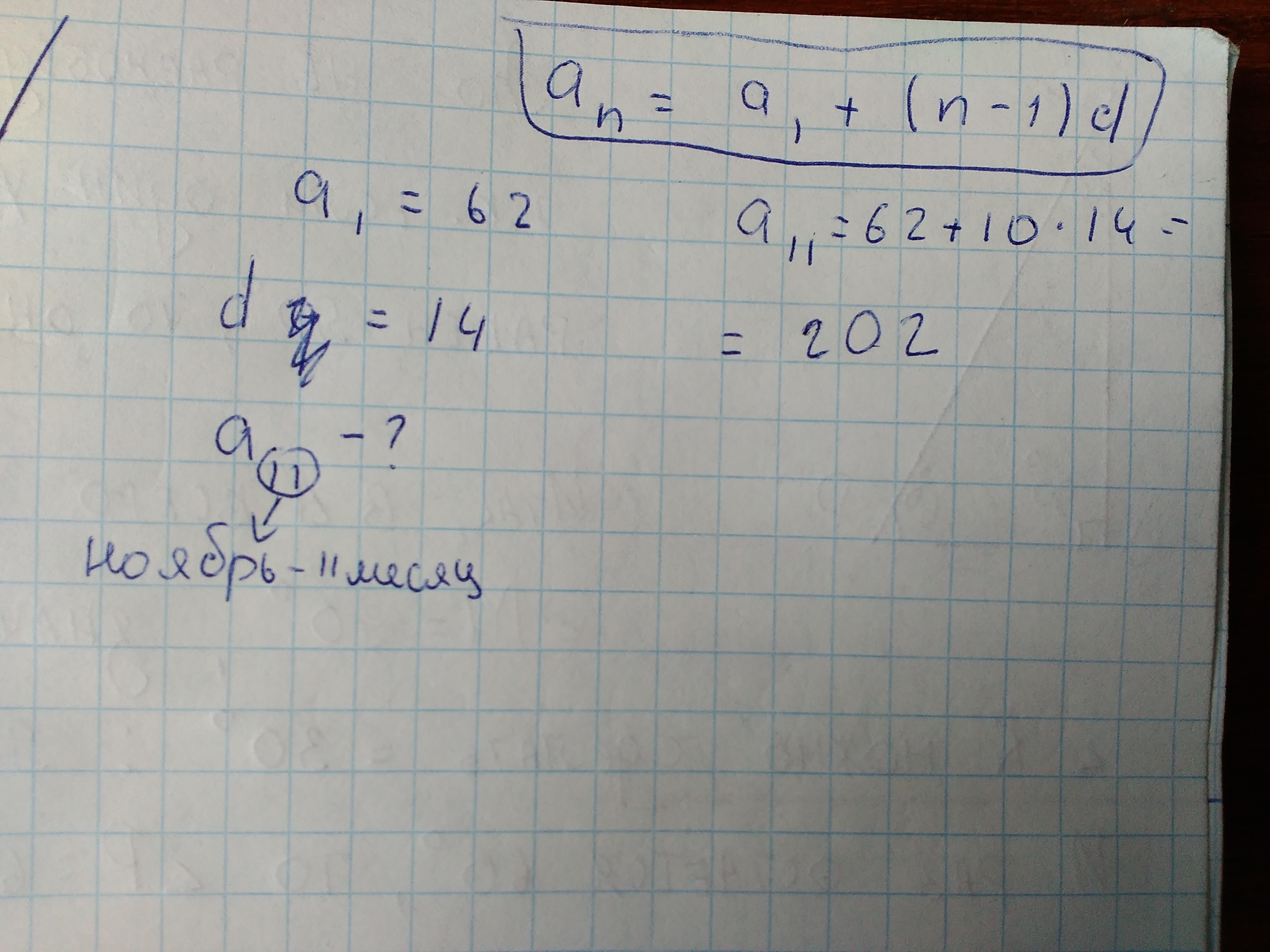 Бригада изготовила в январе 62 детали, а в каждый последующий месяц изготовляла на 14 деталей больше, чем в предыдущий. Сколько деталей изготовила бригада в ноябре того же года???