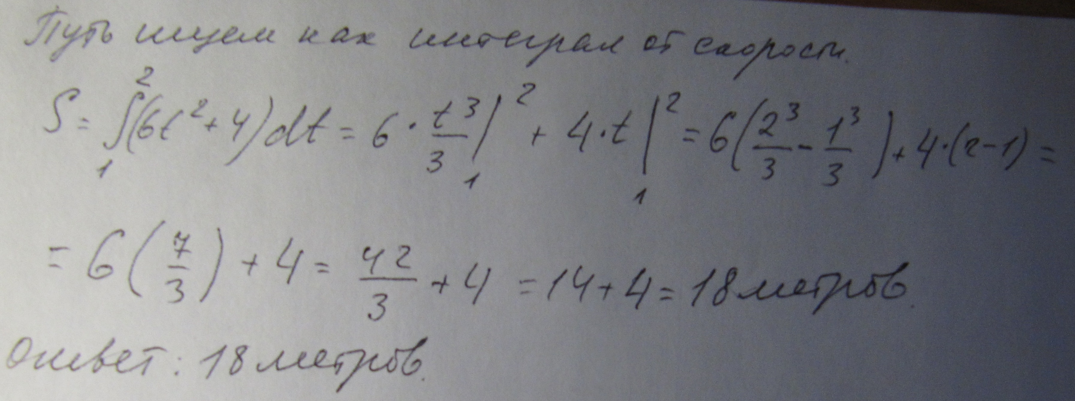 Скорость движения тела задана уравнением v(t)=6t^2+4 (м/с). Найти путь, пройденный телом за вторую секунду.