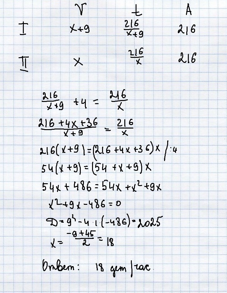Первый рабочий за час делает на 9 деталей больше, чем второй, и выполняет заказ, состоящий из 216 деталей, на 4 часа быстрее, чем второй рабочий, выполняющий такой же заказ. Сколько деталей в час делает второй рабочий?