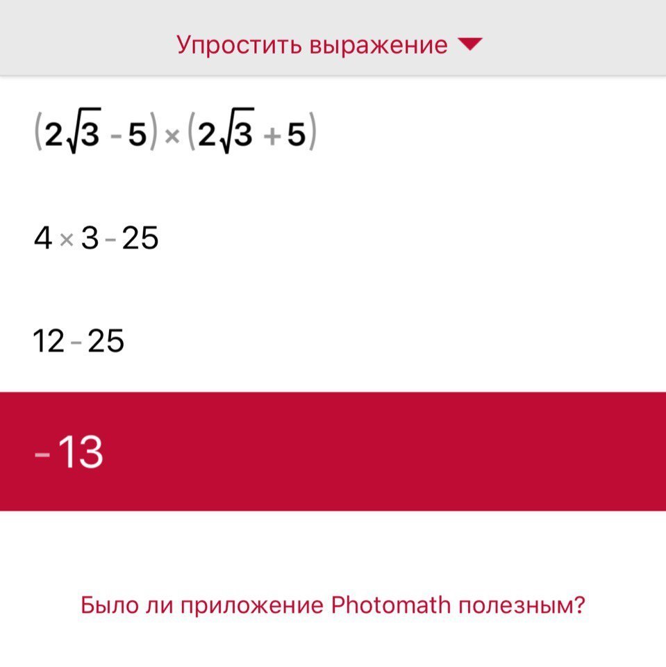 по формуле (а-б)(а+б)=а в квадрате минус б в квадрате: =(2*корень из 3) в квадрате минус 5 в квадрате= -13