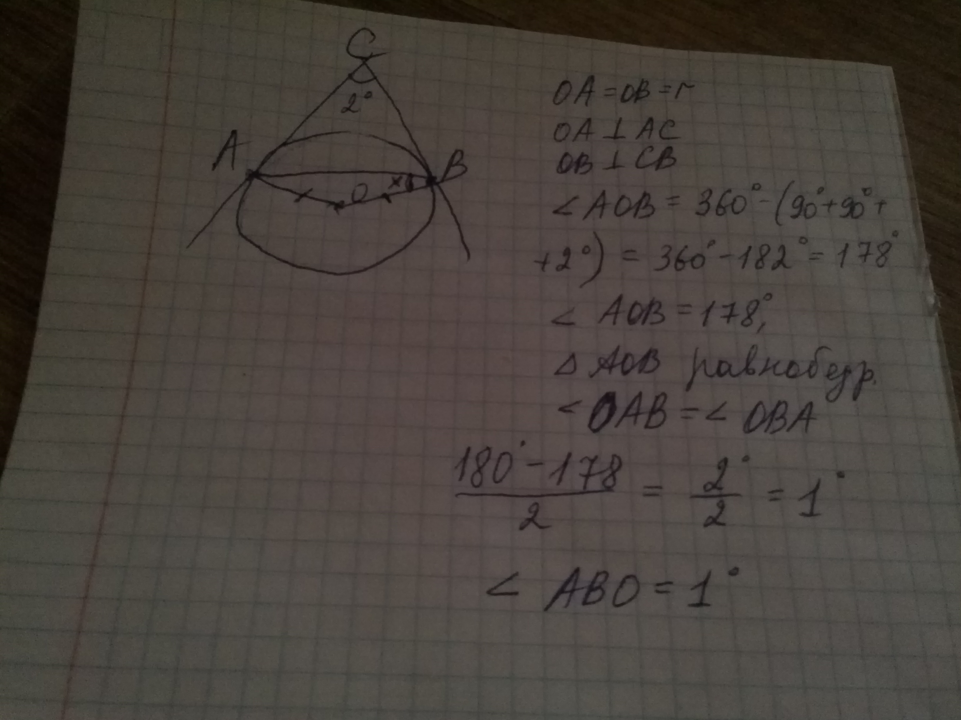 Касательные к окружности с центром O в точках A и B пересекаются под углом 2 градуса. Найдите угол ABO.