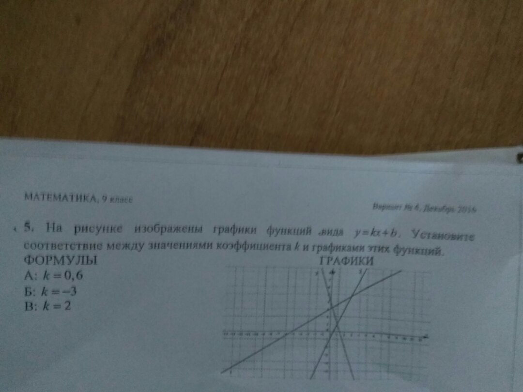 На рисунке изоброжены графики функций вида у=kx+b.Установите соответствие между значениями коффициенты k и графиками этих функций.