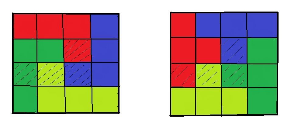 Сколькими способами можно разрезать квадрат, изображённый на рисунке, на 4 равные фигуры так, чтобы в каждую фигуру попало ровно по одному закрашенному квадратику?