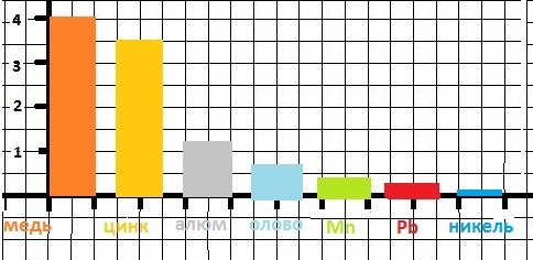 У латуні міститься : міді-40%, цинку 35%, алюмінію 12%, олова 7%, марганцю4%,свинцю1,7%, нікелю 0,3. Побудуйте за цими даними діаграму складну латуні, взявши висоту стовпчика 1см за 10%. Скільки грамів алюмінію міститься в 600 грамах латуні?
