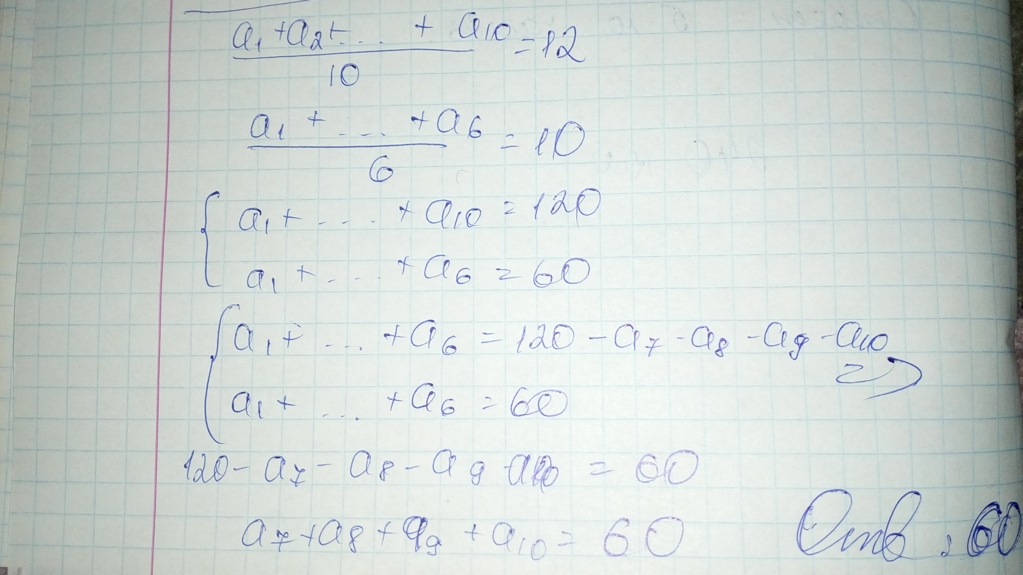 среднее арифметическое десяти чисел равно 12. Среднее арифметическое первых шести из этих чисел равно 10. Найдите среднее арифметическое оставшихся четырёх чисел.