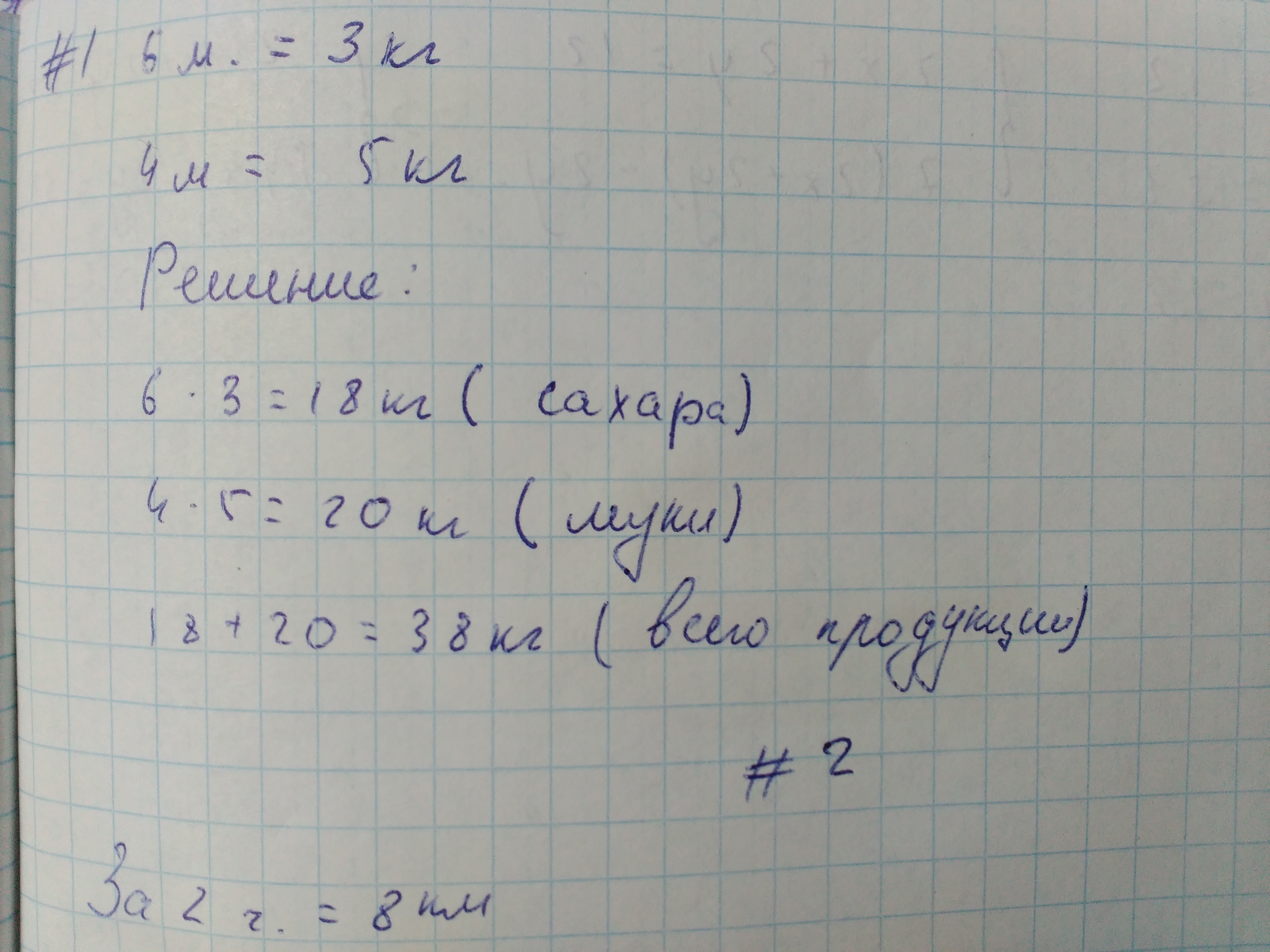 в магазине расфасовали 6 мешков сахара по 3 кг в каждом и 4 мешка муки по 5 кг в каждом. Сколько всего килограммов сахара и муки расфасовали в мешки