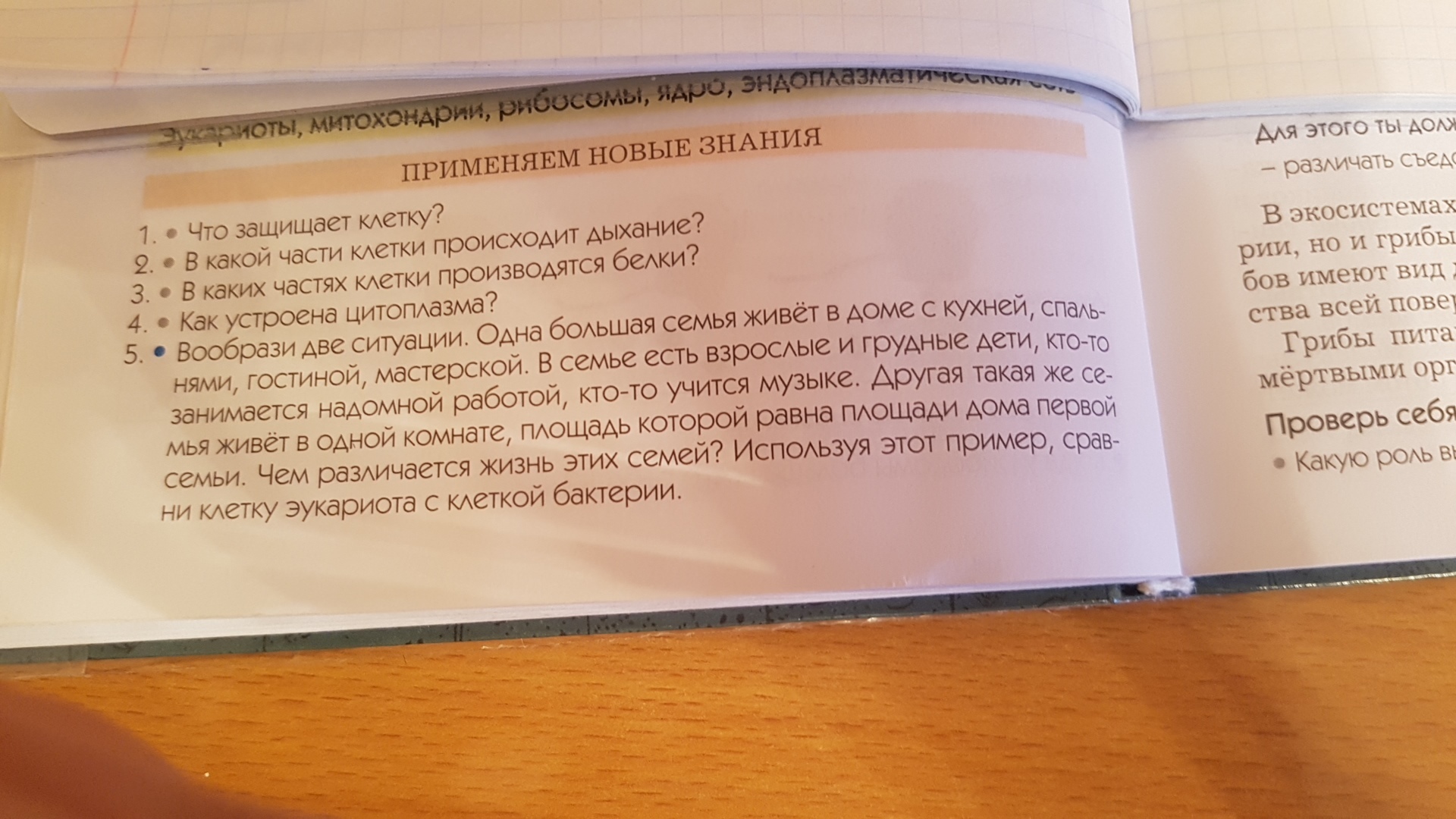 Клетка бактерии меньше клетки эукариота (дома меньше). У клетки эукариота есть ядро (комнаты разделены), а у бактерий нет ядра, и нет разделений.