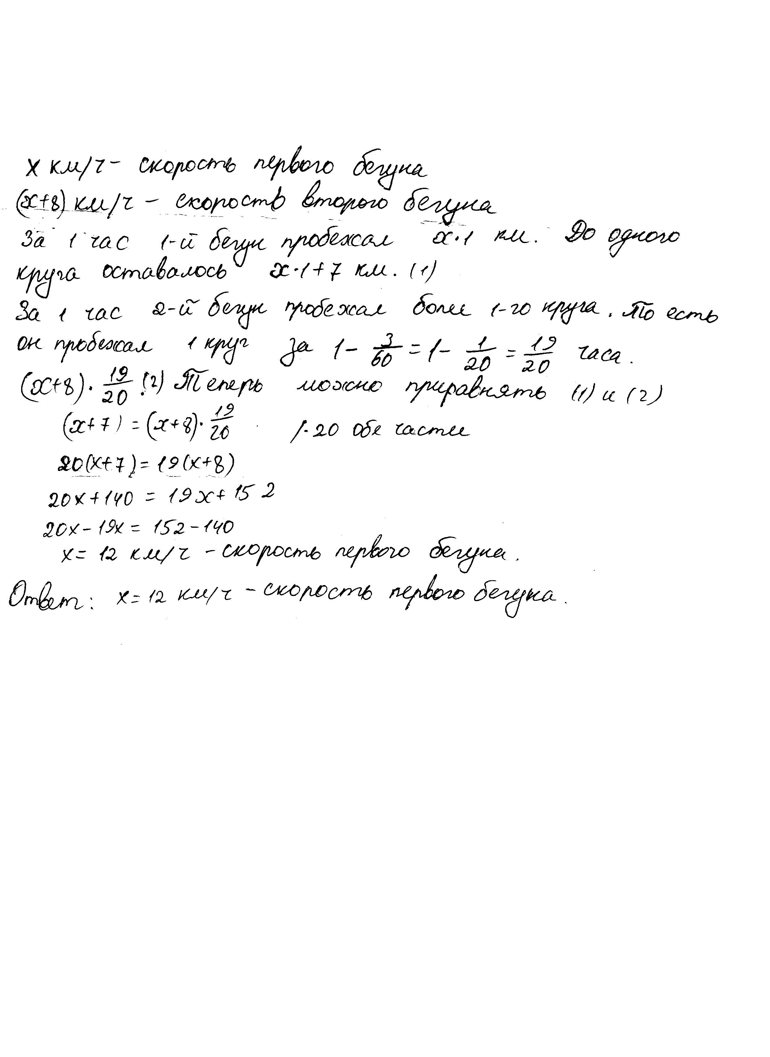 Два бегуна одновременно стартовали в одном направлении из одного и того же места круговой трассы в беге на несколько кругов. Спустя один час, когда одному из них оставалось 7 км до окончания первого круга, ему сообщили, что второй бегун прошёл первый круг 3 минуты назад. Найдите скорость первого бегуна; если известно, что она на 8 км/ч меньше скорости второго.