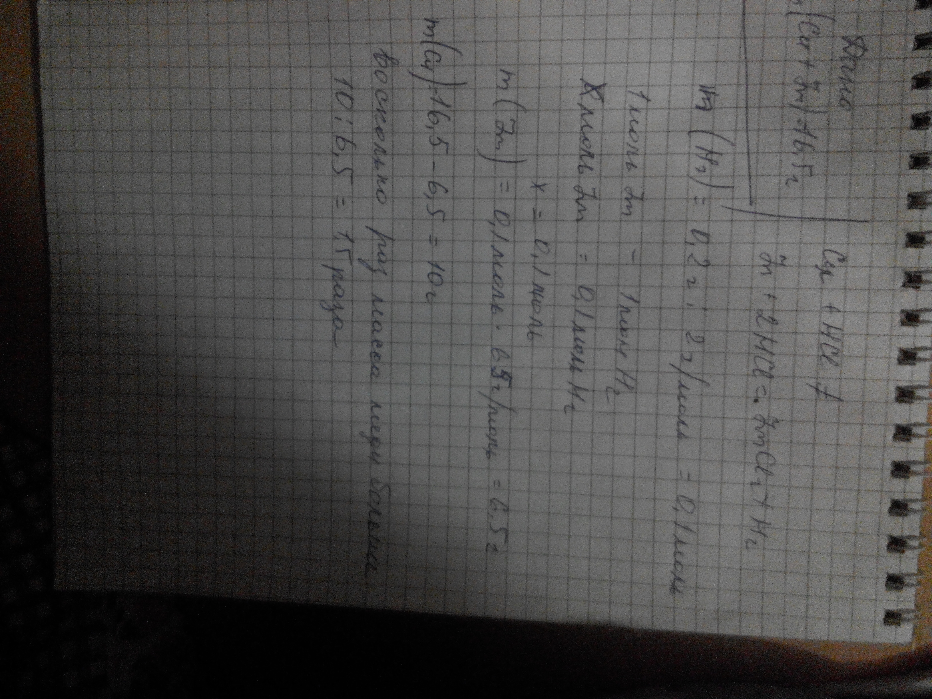 1.Смесь меди и цинка обработали соляной кислотой.Масса исходной смеси 16,5 г. В результате реакции выделился водород массой 0,2 г.Во сколько раз масса меди больше массы цинка в исходной смеси?