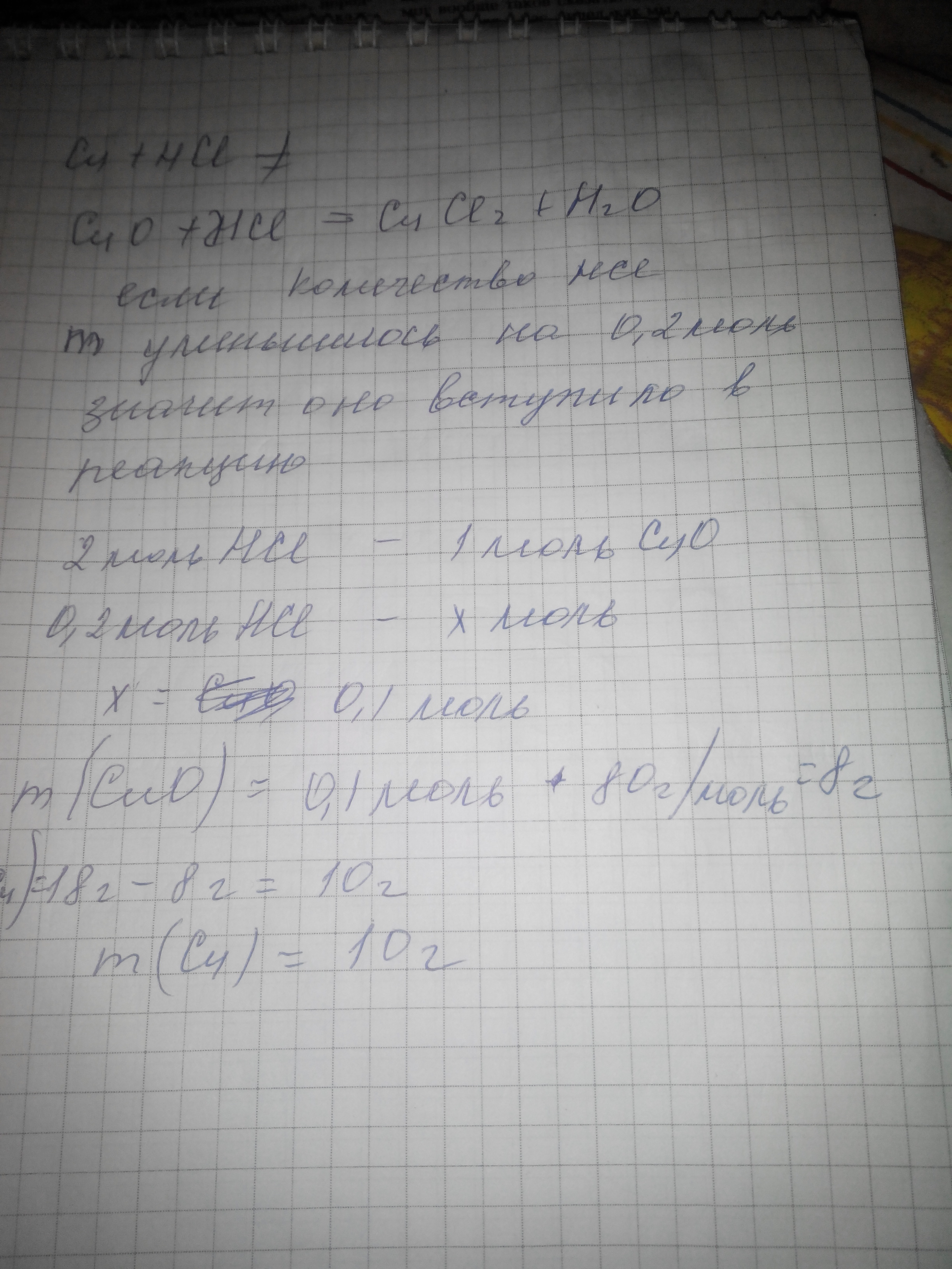 2.Смесь массой 18 г ,состоящей из оксида меди(2) и меди обработали избытком соляной кислоты.После окончания реакции химическое количество хлороводорода уменьшилась на 0,2 моль. Определите массу меди в исходной смеси.