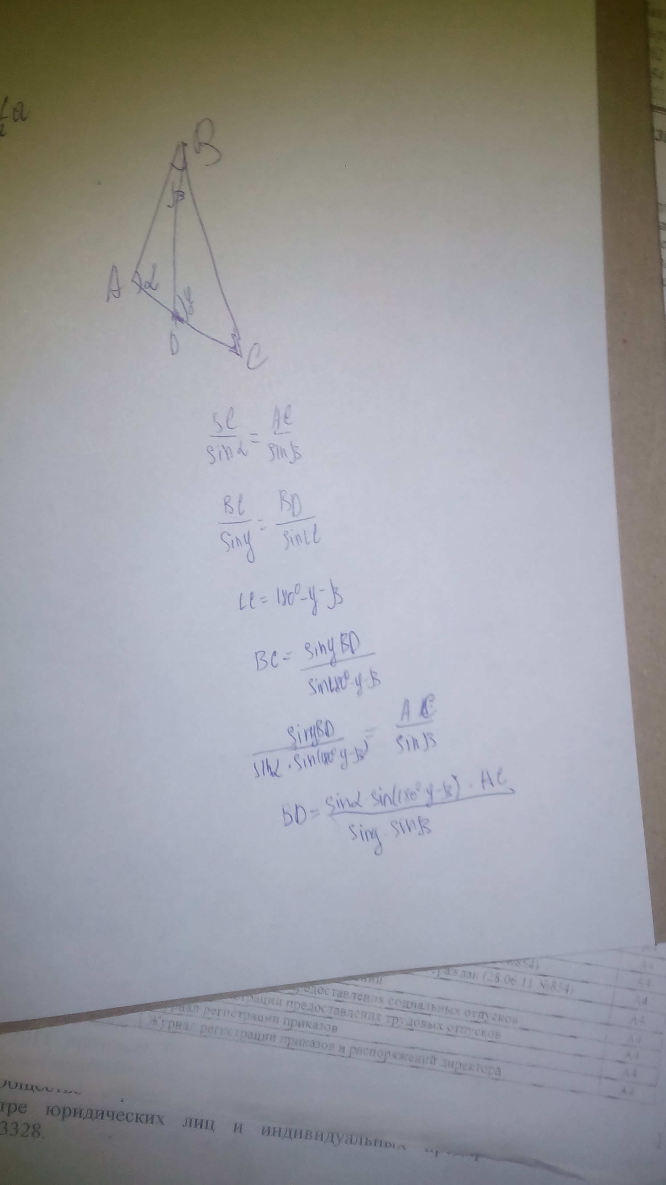 в треугольнике абс угол а равен альфа, угол б равен бетте, точка д лежит на стороне ас, угол вдс равет гамма. Найдите бд