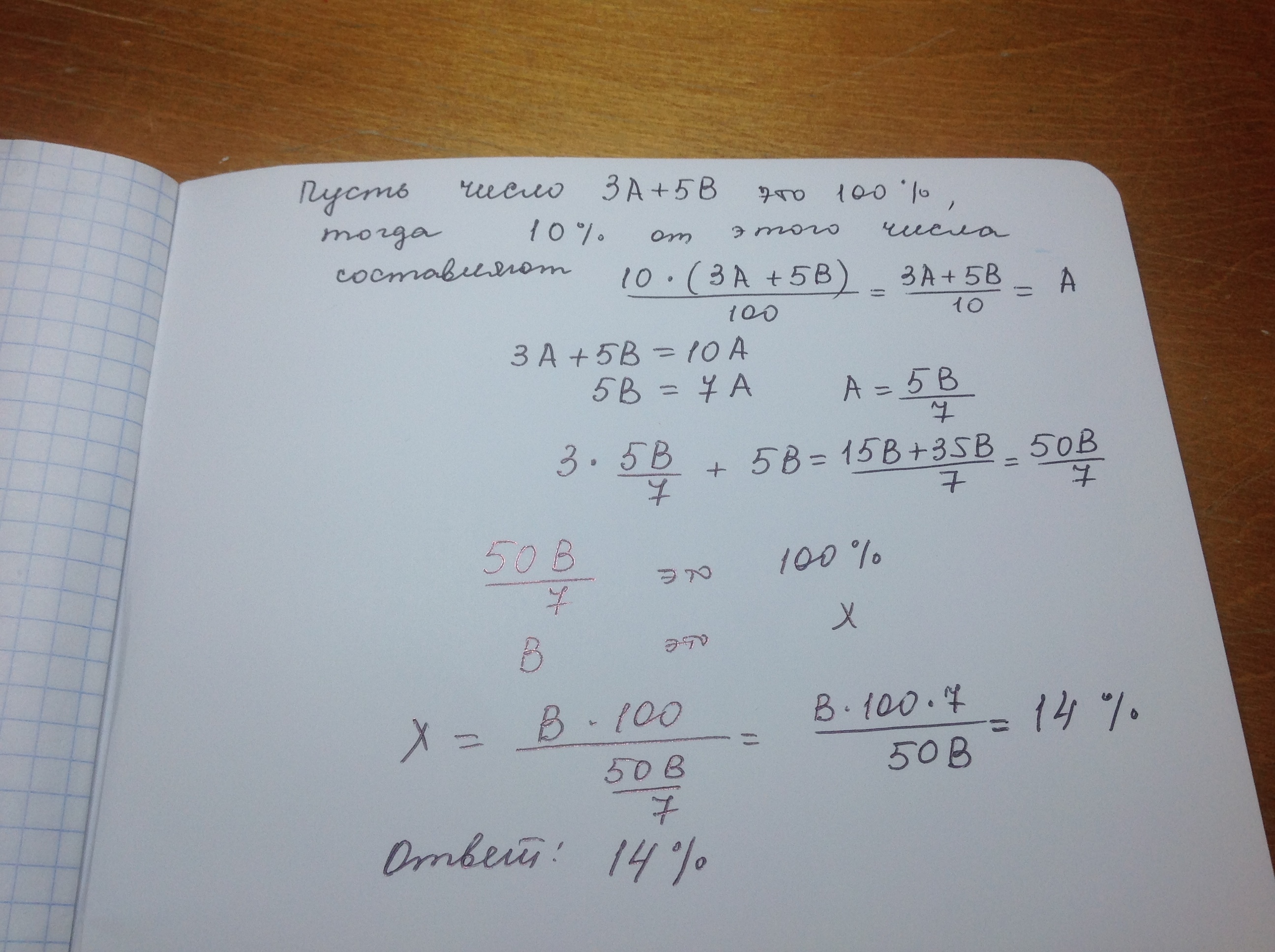 Положительные числа AA и BB таковы, что число AA составляет 10 % от числа 3A+5B3A+5B. Сколько процентов от этого числа составляет число BB?