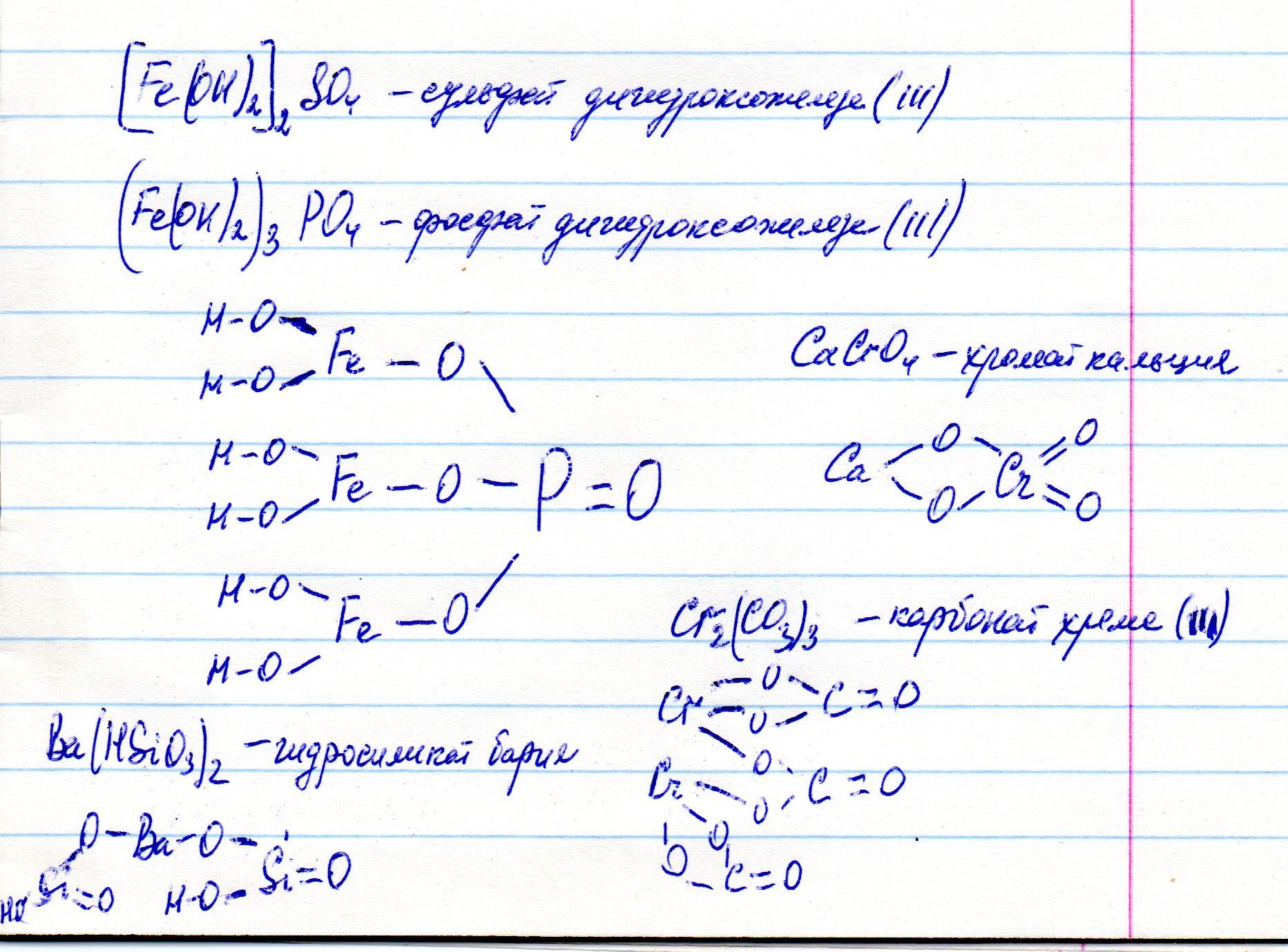 CaCrO4. ( Fe(OH)2)3PO4. Cr2(CO3)3 Ba (HsiO3)2 написать графические формулы , дать название по Штоку с приставками греческим числительными