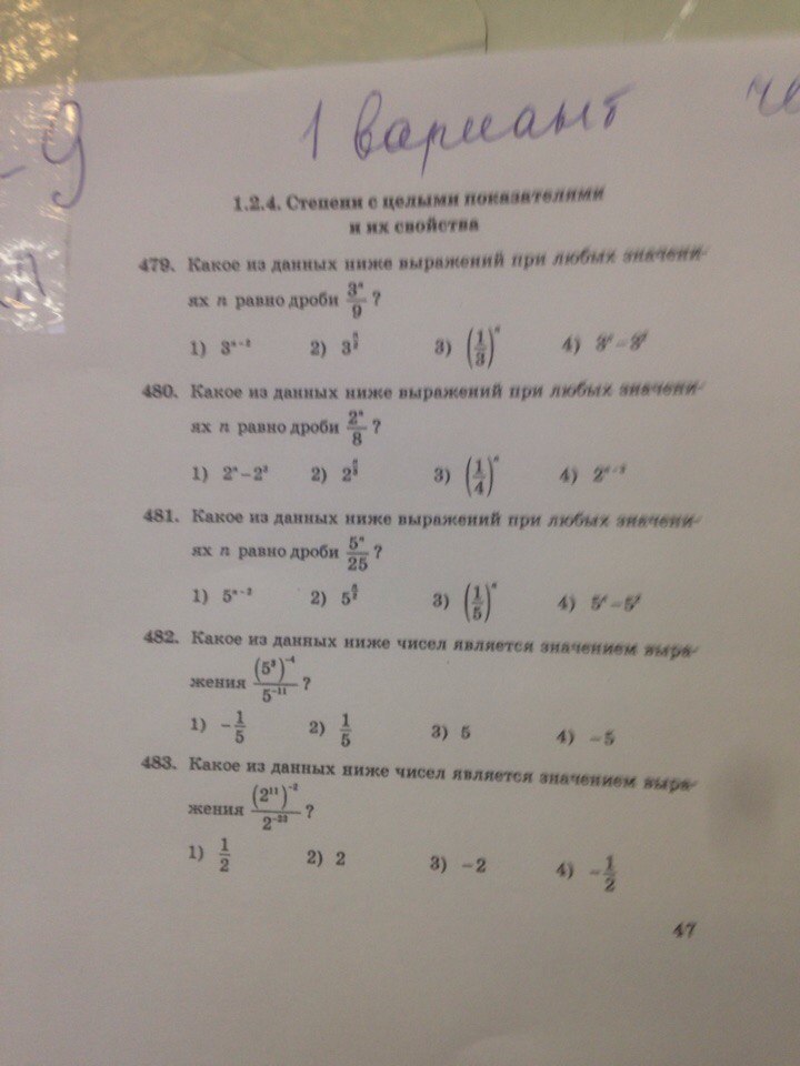 482) (5³)⁻⁴ / 5⁻¹¹ = 5⁻¹² / 5⁻¹¹ = 5⁻¹²⁻⁽⁻¹¹⁾ = 5⁻¹²⁺¹¹ = 5⁻¹=1/5