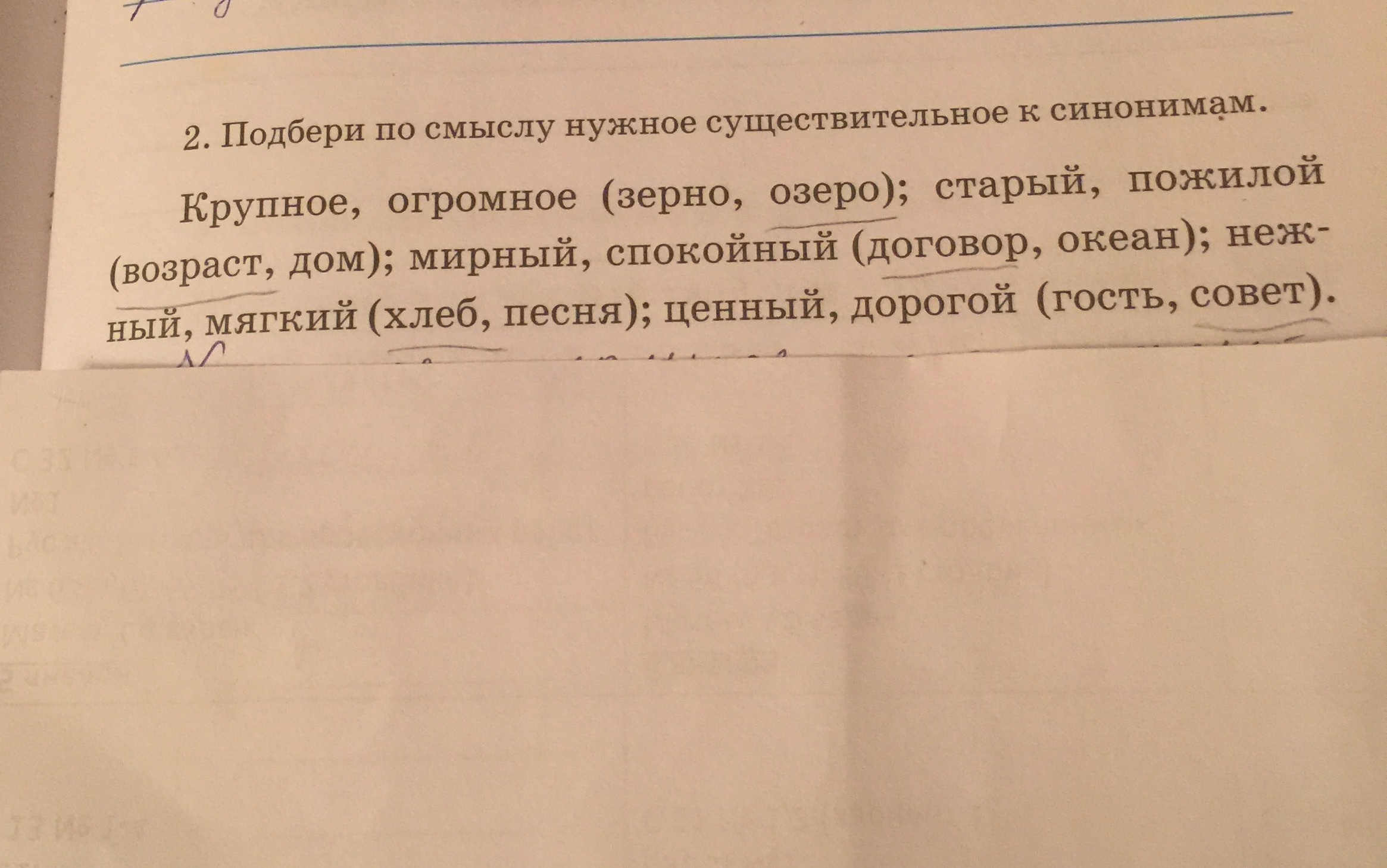 крупное зерно, огромное озеро; старый дом, пожилой возраст; мирный договор, спокойный океан; мягкий хлеб, нежная песня; ценный совет, дорогой гость.