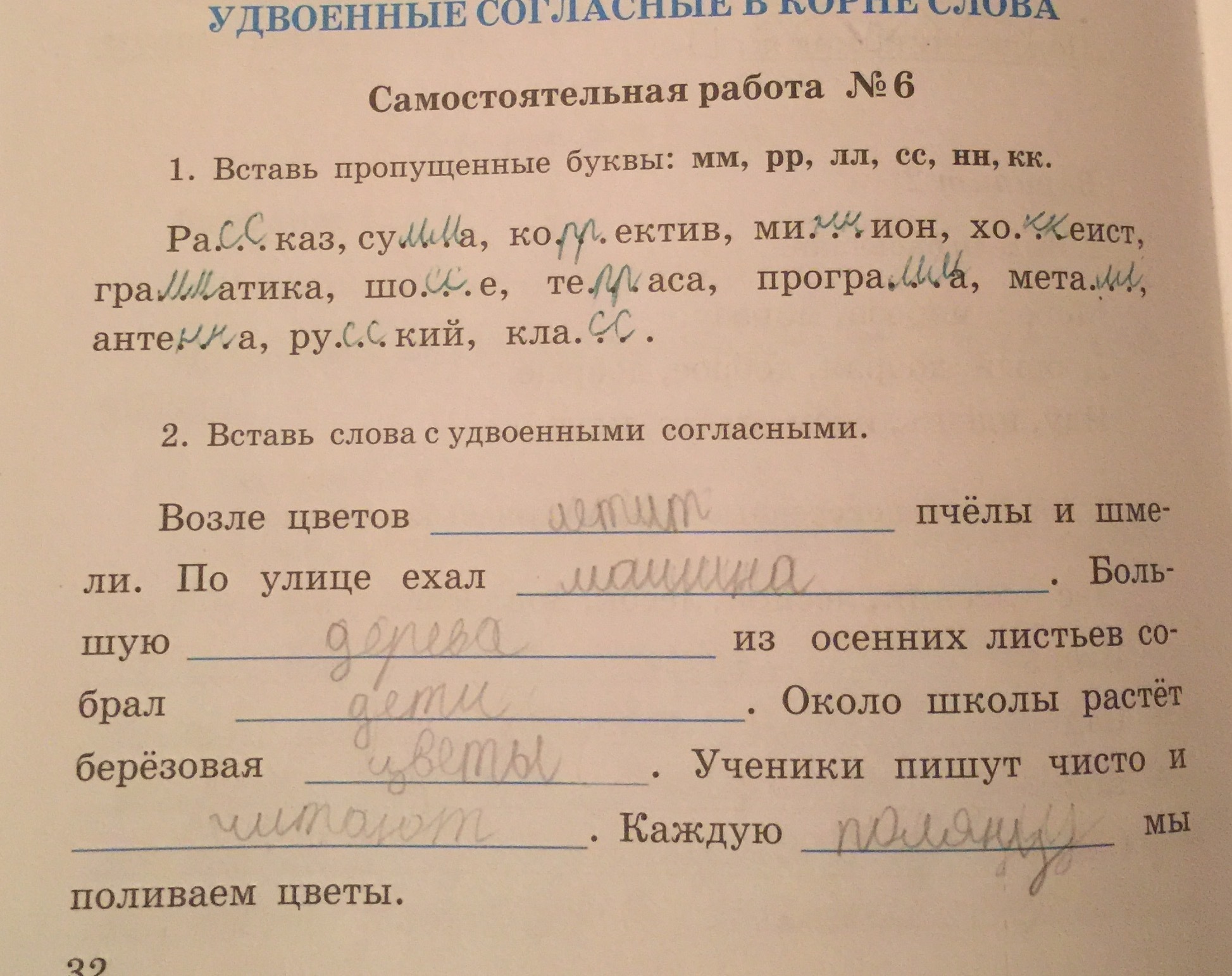 Возле цветов жужжат пчелы и шмели. На улице ехал троллейбус. Большую коллекцию из осенних листьев собрал юннат. Около школы растет березовая аллея. Ученики пишут красиво и аккуратно. Каждую субботу мы поливаем цветы.
