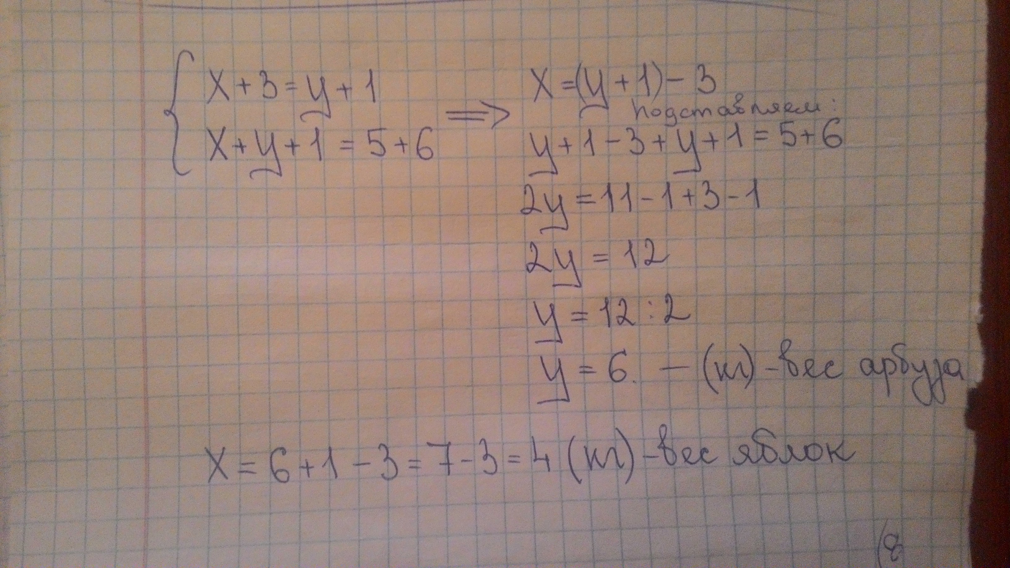 Примем вес яблок за x, арбуза - за y. Тогда можем составить следующую систему уравнений