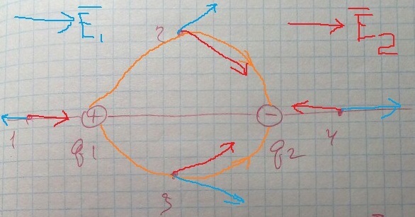 Вектор E1 (синий) ОТ ПОЛОЖИТЕЛЬНОГО заряда