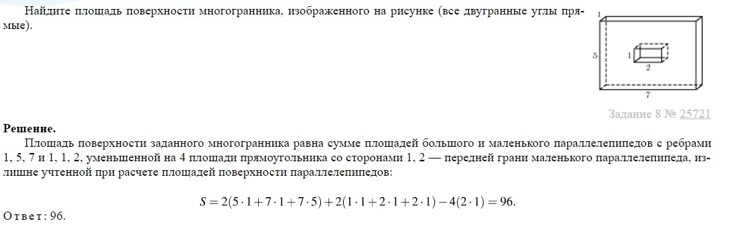 задняя грань такая же . ещё 33. боковые наружние грани - две по 5*1 и две по 7*1 ещё 24. внутри дырка два раза 1*2 и два раза 1*1 - ещё 6. всего 96.