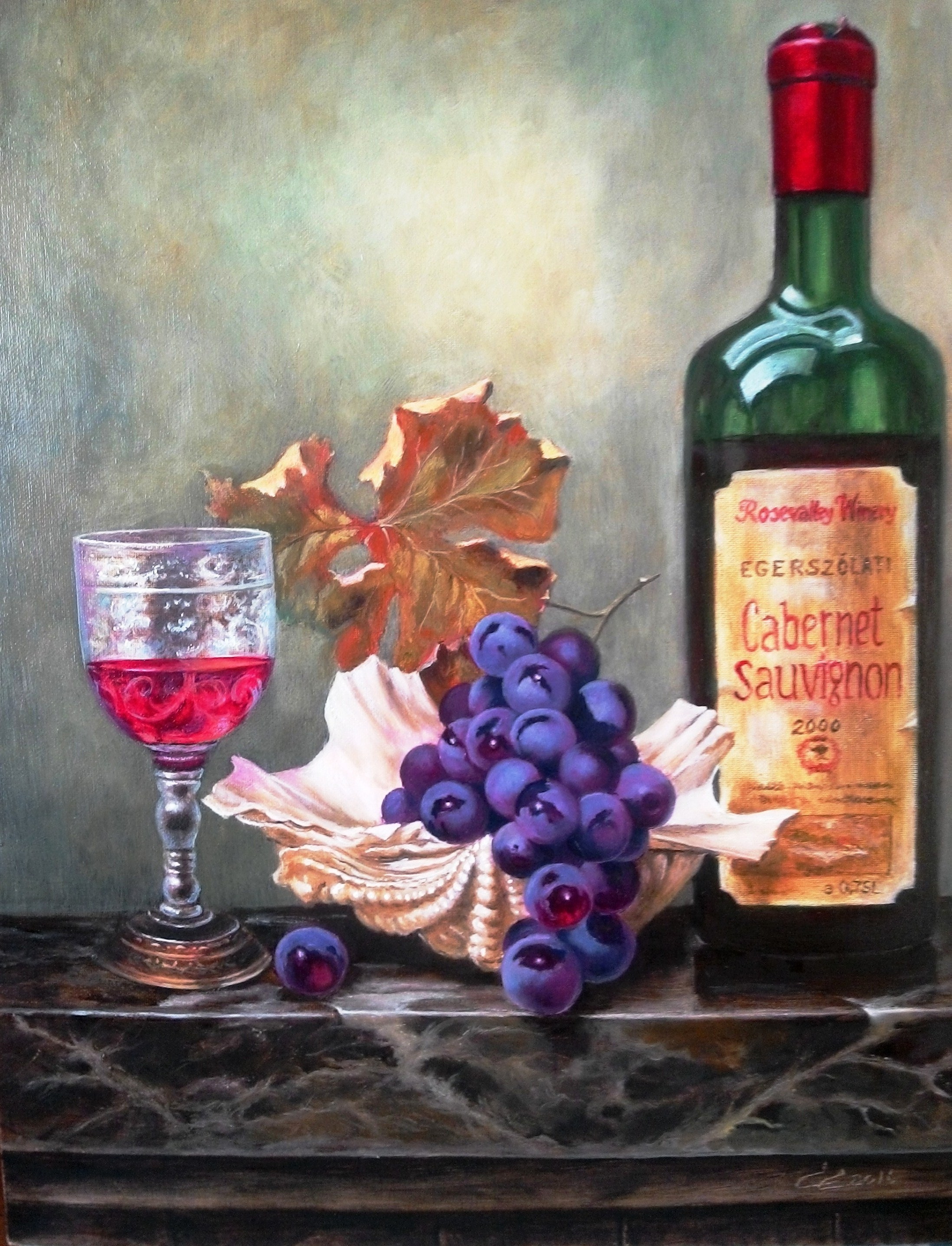 По надписям мы видим что картина не русская и по дате что сделана или до 2000 года.На картине мы видим бакал с вином и будилку вина с виноград и то что эта картина была нарисованна осенью или художник просто захотел нарисовать её на таком фоне.