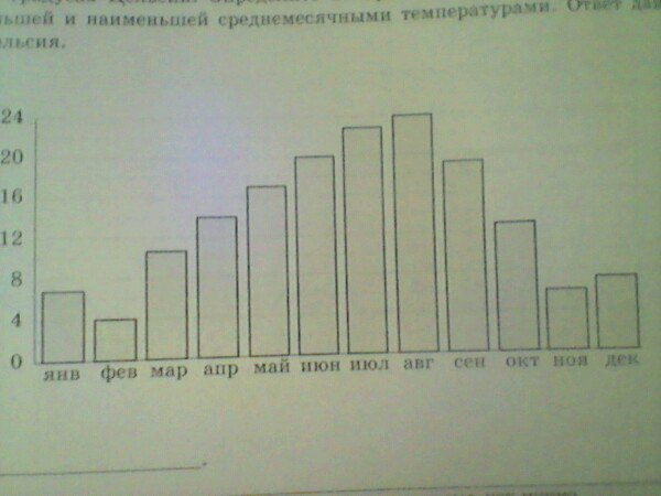 Наименьшая температура преобладает в феврале 4°,а наибольшая температура в августе 24°