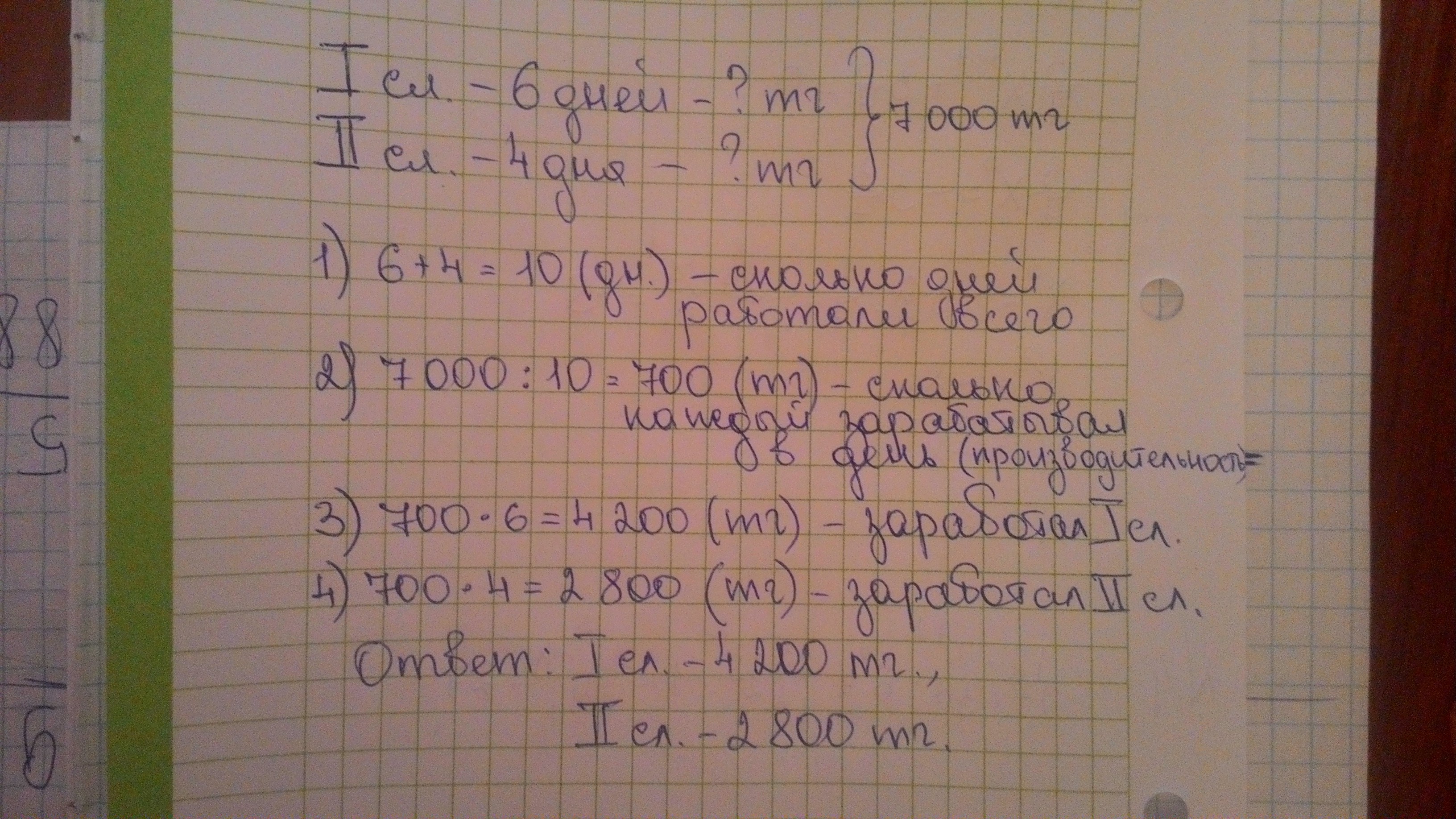 Два ученика слесаря получили 7000 тенге . Сколько за работал каждый из них , если первый работал 6 дней, а второй 4 дня с одинаковый производительностью труда?