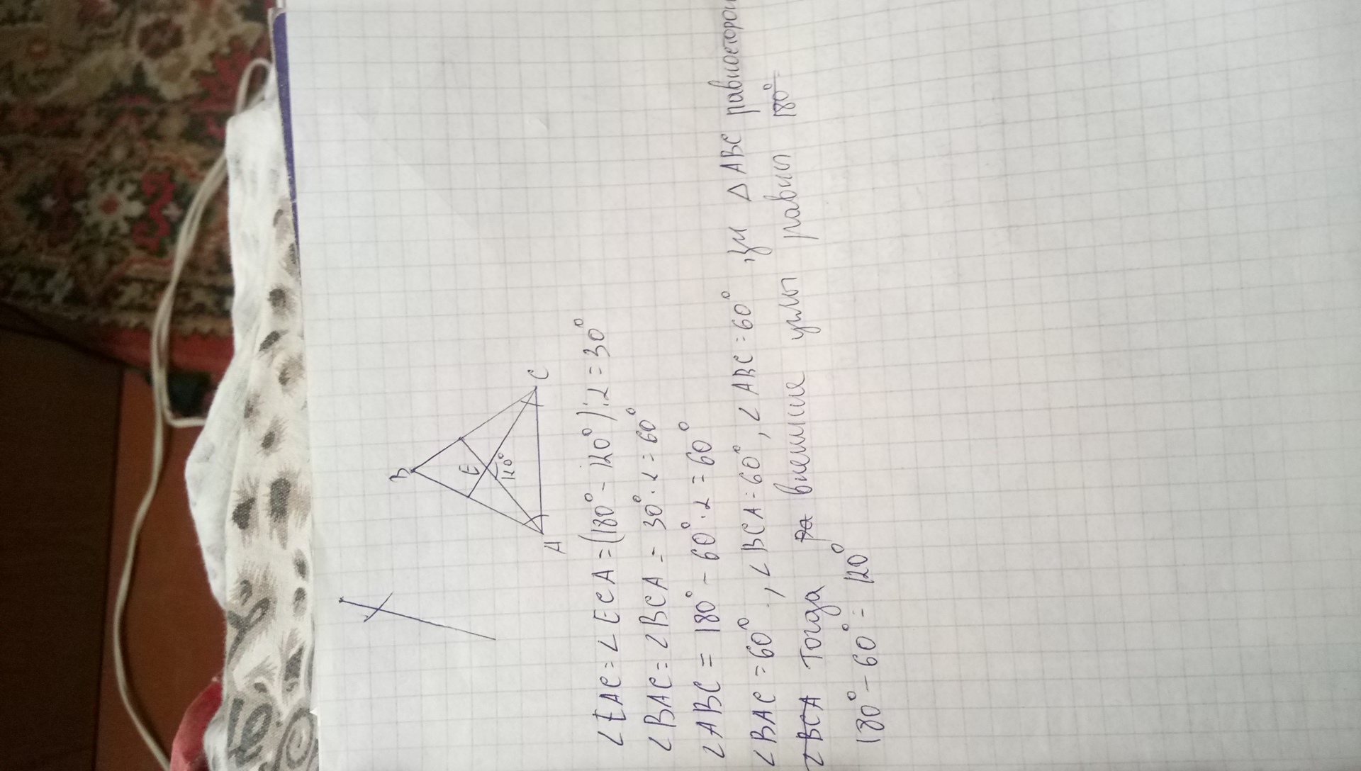 Треугольник АВС-равнобедренный, АС-основание, Е-точка пересечения биссектрис углов А и С. Угол АЕС равен 120.Найдите внешние углы треугольника