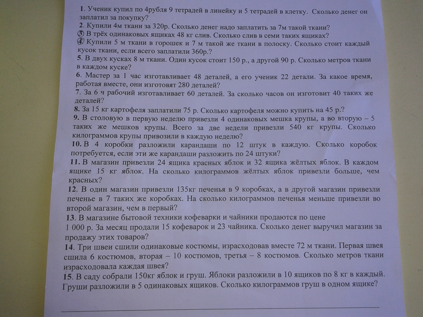 3 номер .Решение : 48 :3 =16 кг -- это сколько кг слив в одном ящике. И 16 ×7 = 112 - узнали ск- ко кг слив в семи ящ . 4. номер задачи. 5+7:=12 м - всего ткани купили .360 : 12=30 ( руб) . -стоит 1 м ткани . Потом 5 ×30 = 150 ( руб) - стоит 5 м ткани в горошек . От 360 - 150 =210 ( руб )