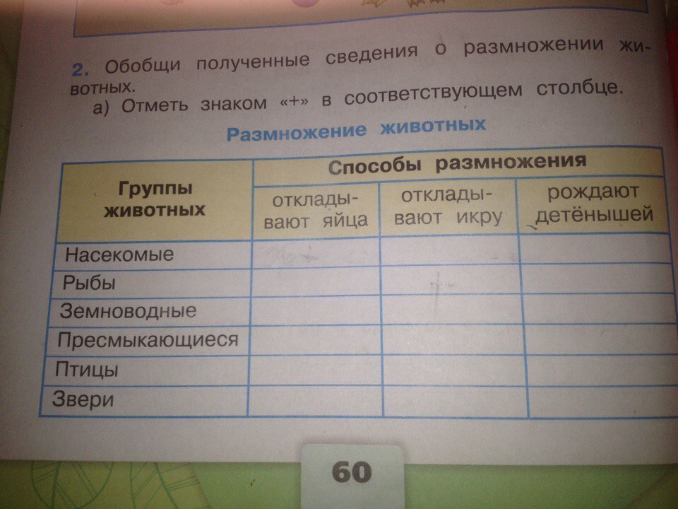 Насекомые, земноводные, пресмыкающиеся, птицы откладывают яйца. Рыбы откладывают икру, а звери рождают детёнышей.