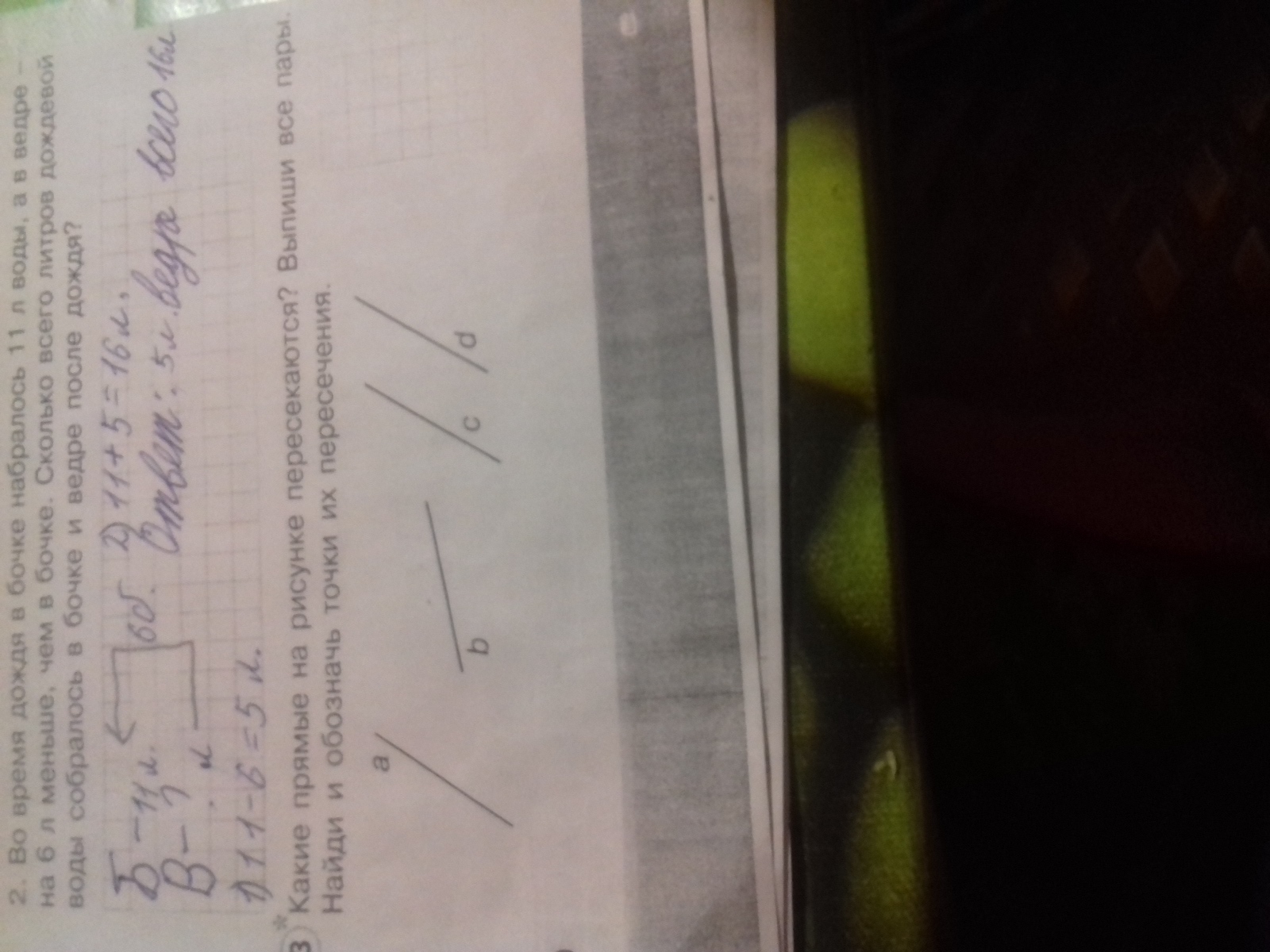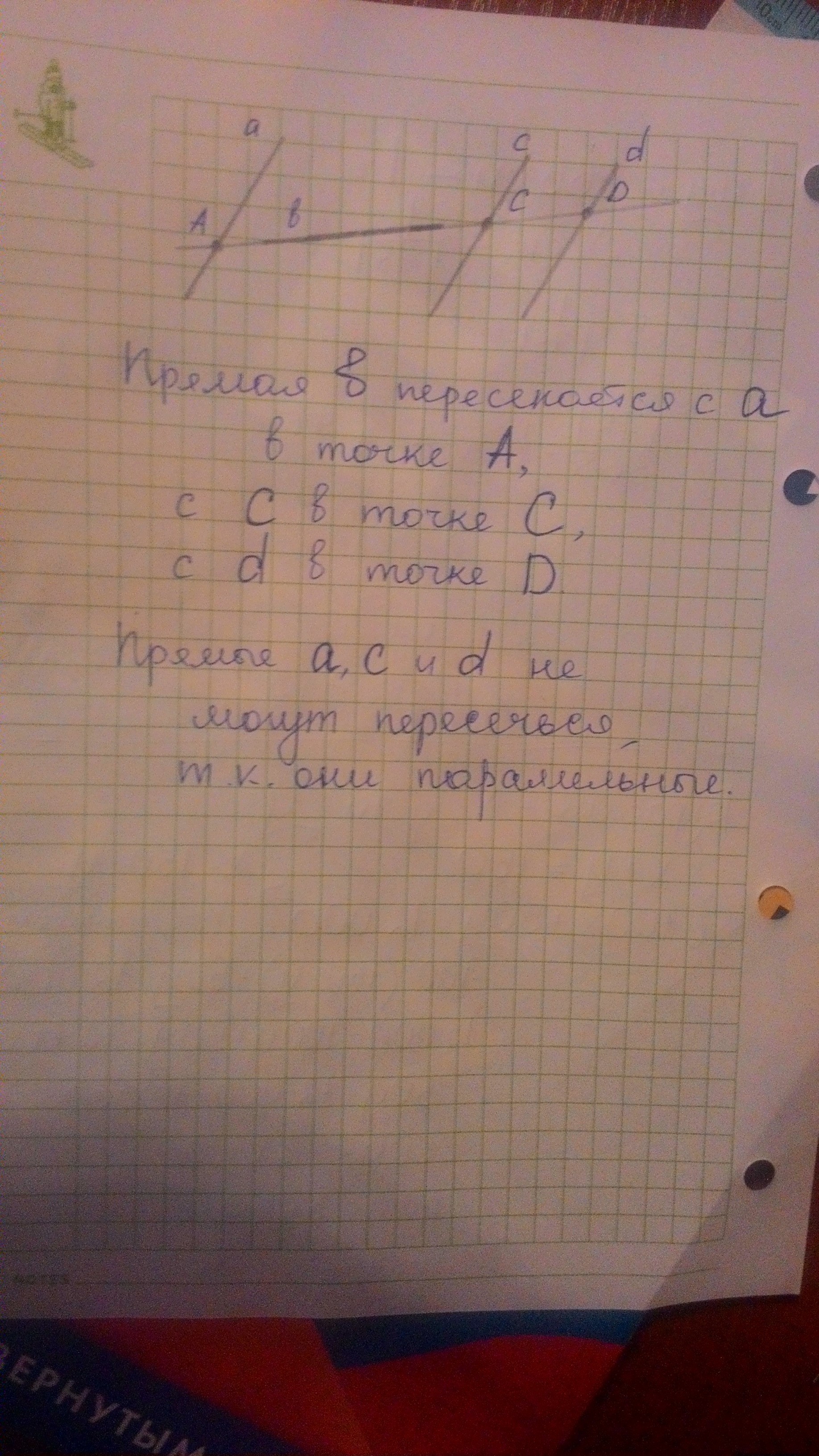 Только прямая b пересекается со всеми остальными. Продолжите её на рисунке и точками обозначьте, где она пересекается с a, c и d.