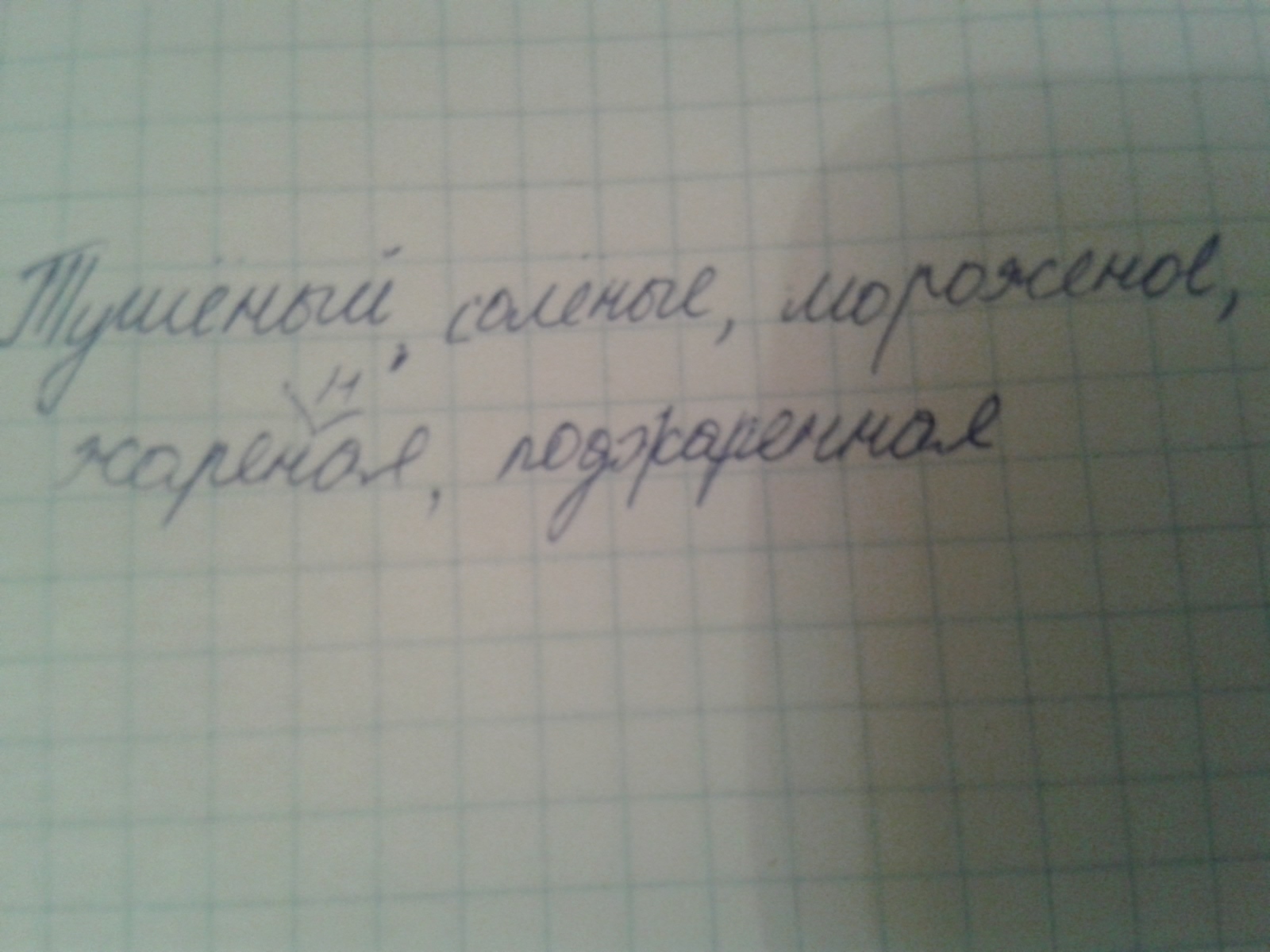 Туше...ый картофель, соле...ые в бочке огурцы, мороже...ое мясо, варе...ые овощи, жаре...ая в сметане рыба , поджаре...ая рыба .