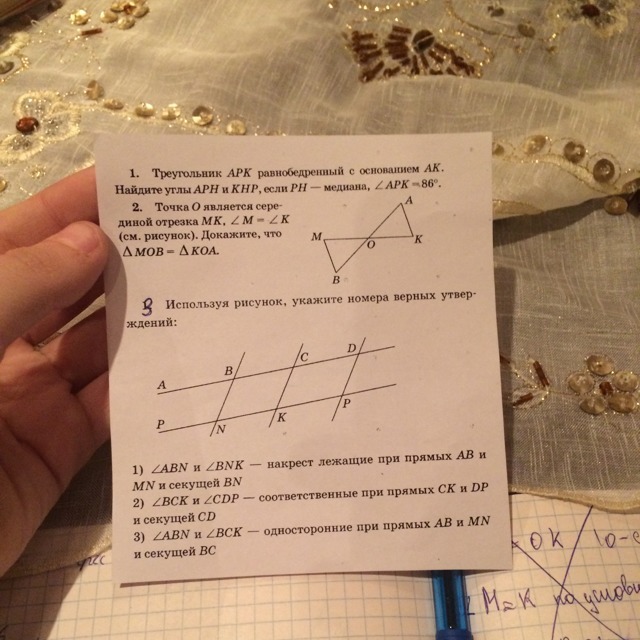 2. МО = ОК (по условию), угол М = углу К (по усл.), угол МОВ = углу АОК (по свойству вертикальных углов). Значит, эти треугольники равны (по стороне и двум прилежащим углам).