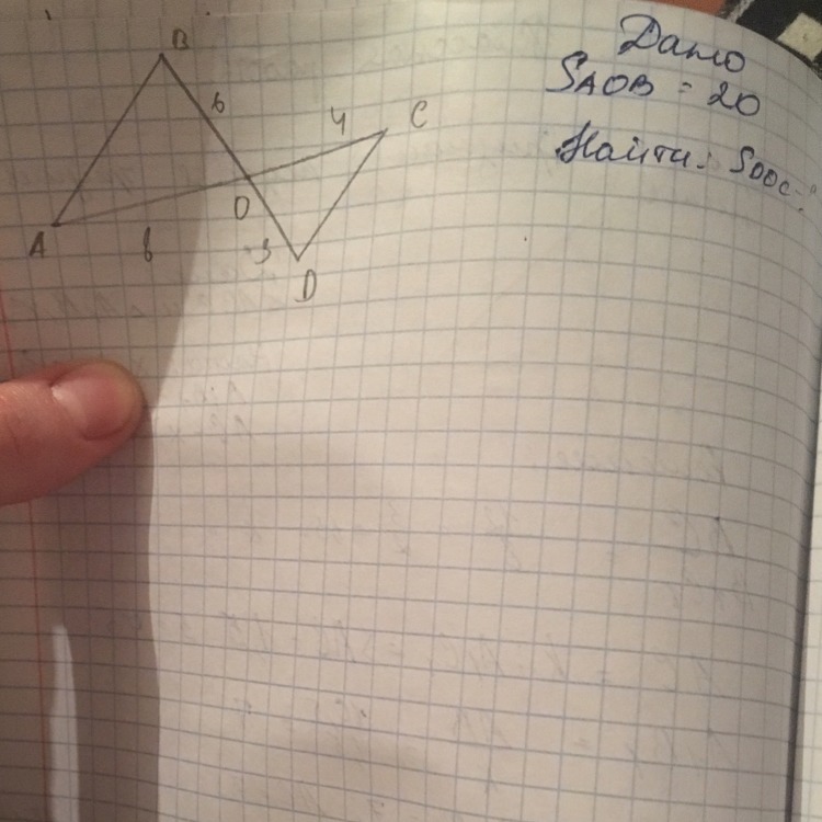 угол ВОА=СОD так как они вертикальные. ВО/OD=AO/OC=2 => треугольники подобны по двум сторонам и углу между ними, а значит и подобны площади этих треугольников. Площадь ВАО=2*СОD => COD=20/2=10